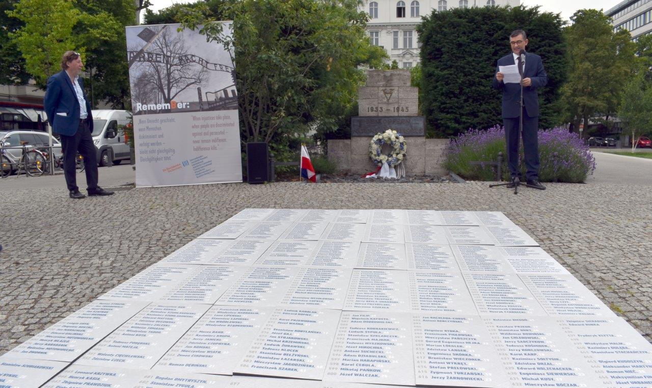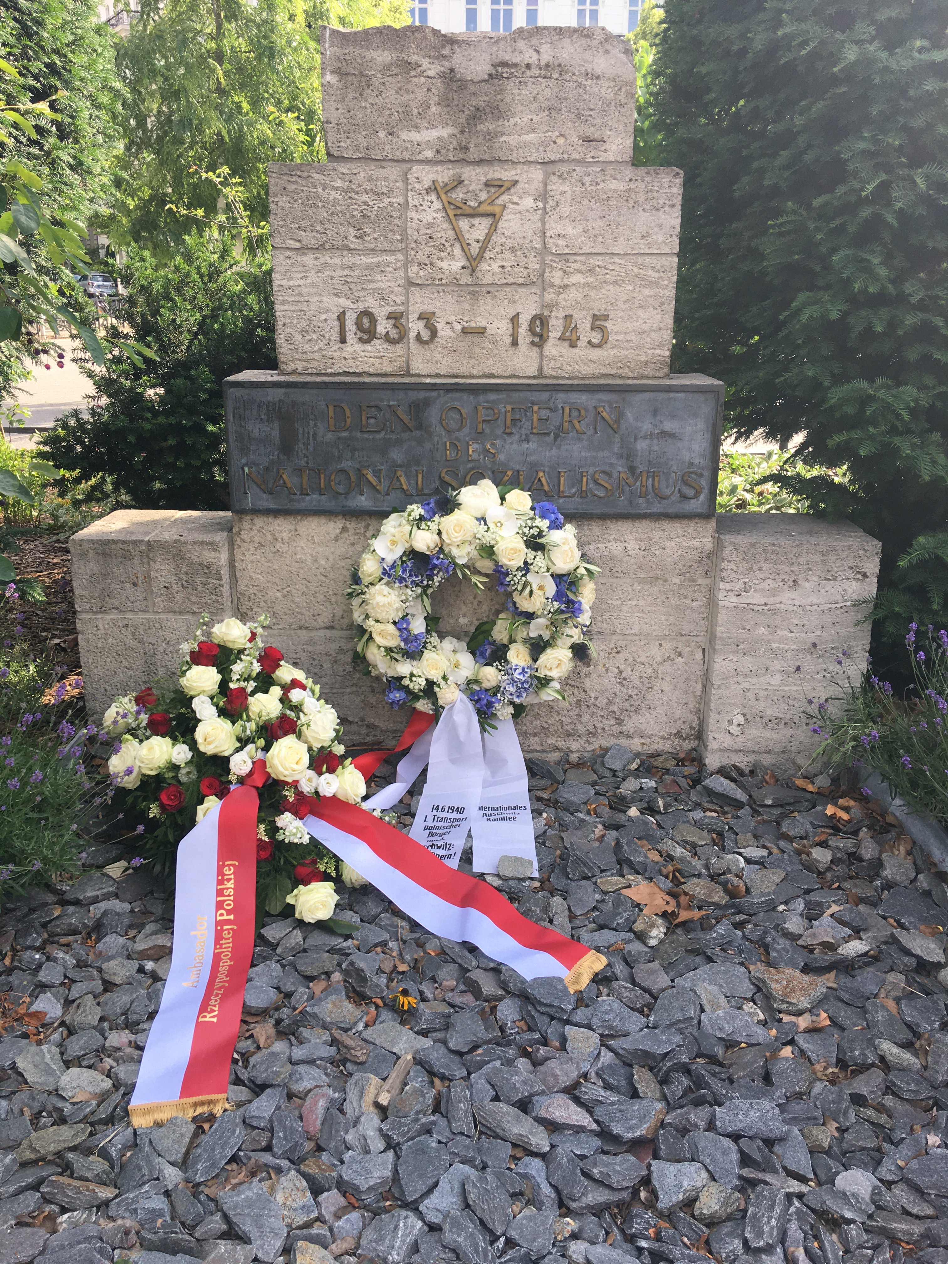 Der polnische Botschafter legte Blumen vor dem Denkmal für NS-Opfer nieder, wo an dem heutigen Tag Tafeln mit Namen aller polnischer Opfer des Massentransportes in das KZ Auschwitz ausgelegt wurden.