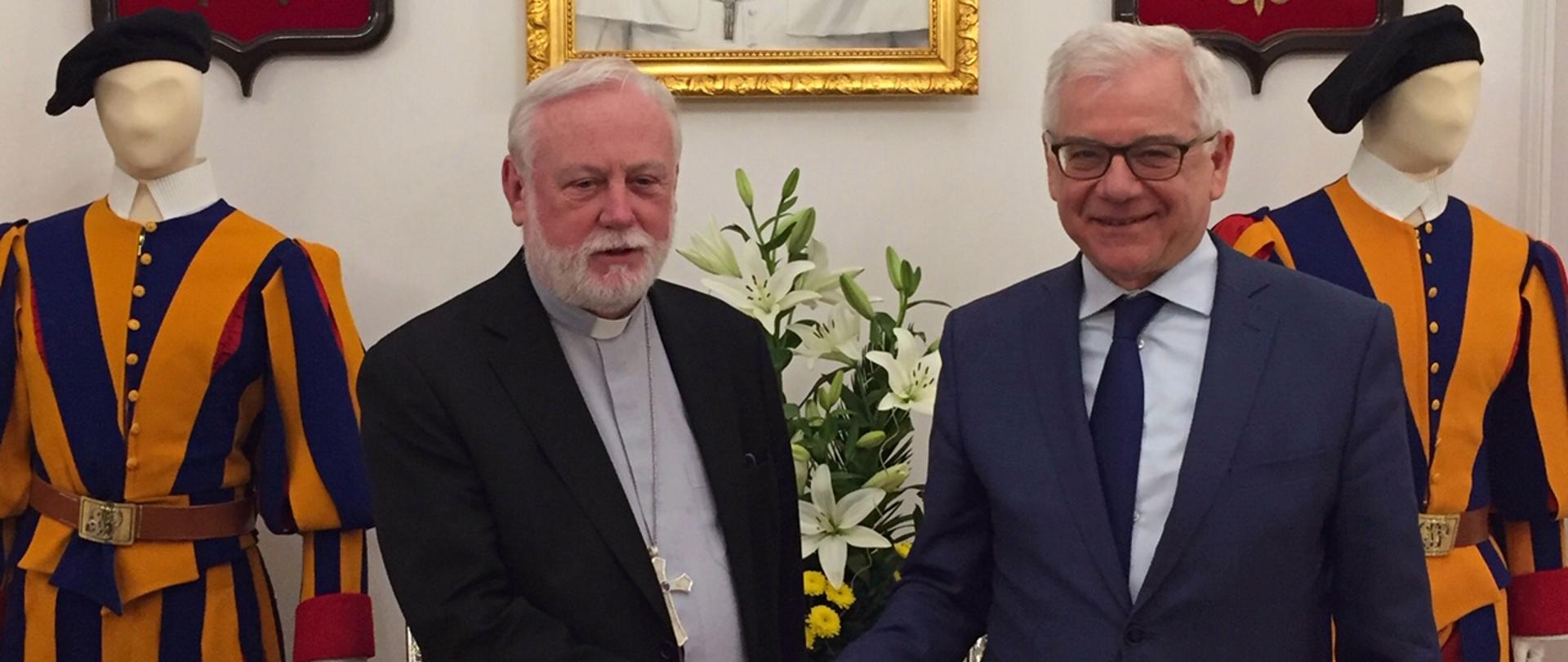 The meeting focused on a review of mutual relations, specifically in the anniversary context and was an opportunity to discuss plans for further cooperation between Poland and the Holy See. Matters relating to the situation of Christians in the world were also raised. Minister Czaputowicz informed the Archbishop about Poland’s priorities during its presidency of the UN Security Council in August this year, including the initiative to establish the International Day Commemorating Victims of Religious Violence. They also discussed the future of the European Union and elections to the European Parliament.