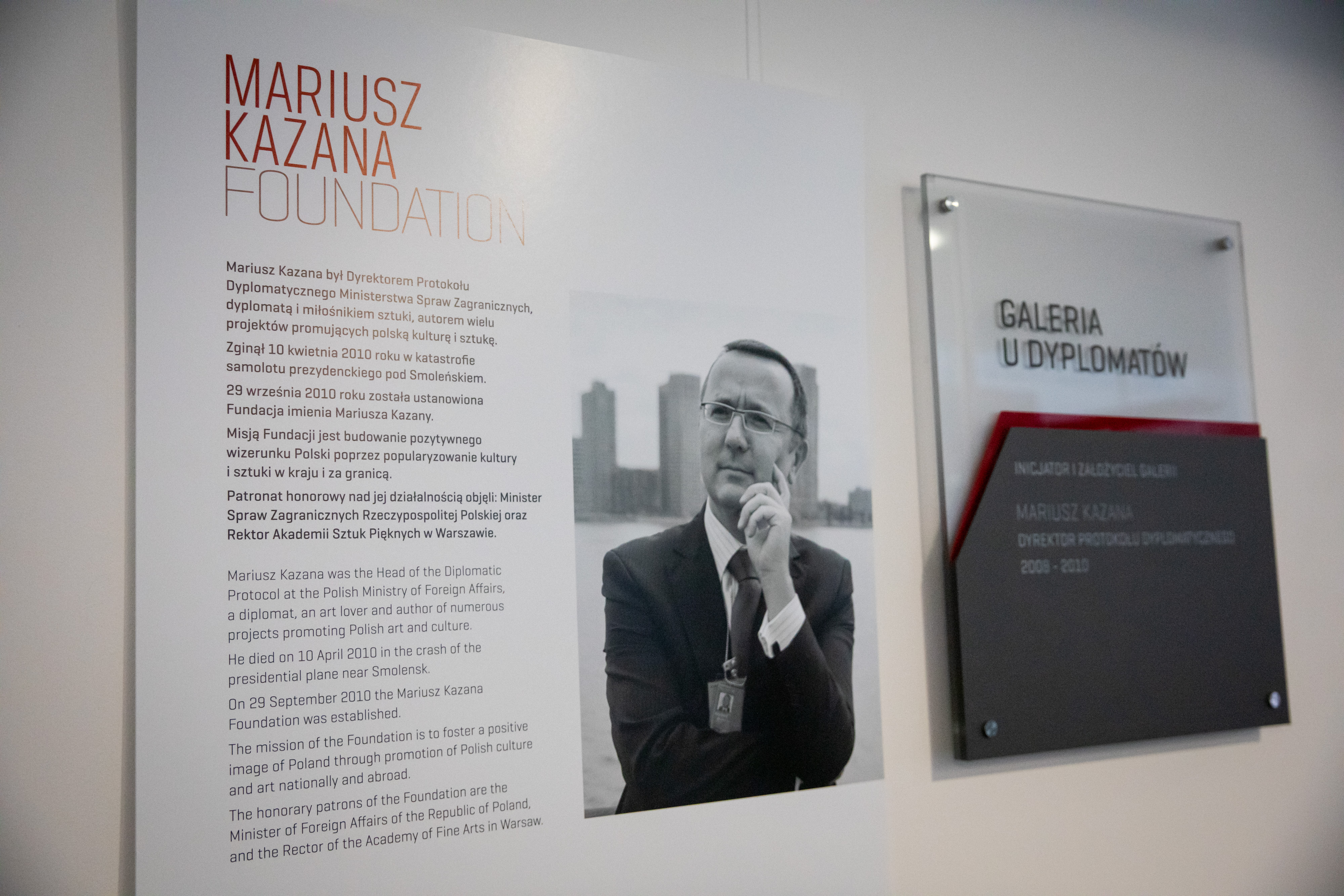 The Mariusz Kazana Foundation was established on September 29, 2010. After Mariusz Kazana's tragic death in the presidential plane crash near Smolensk on April 10th 2010, the widow, her daughter and a group of friends took the initiative to create a Foundation named after him. Mariusz Kazana was the Director of the Diplomatic Protocol of the Ministry of Foreign Affairs, a diplomat and art lover, the author of many projects promoting Polish culture and art. The Foundation promotes the knowledge about Mariusz Kazana and his interests, continuing projects that he did not manage to implement. The mission of the Foundation is to build a positive image of Poland by popularizing culture and art in the country and abroad. From the day of its creation, contemporary Polish graphics have been the focal point of its activity.