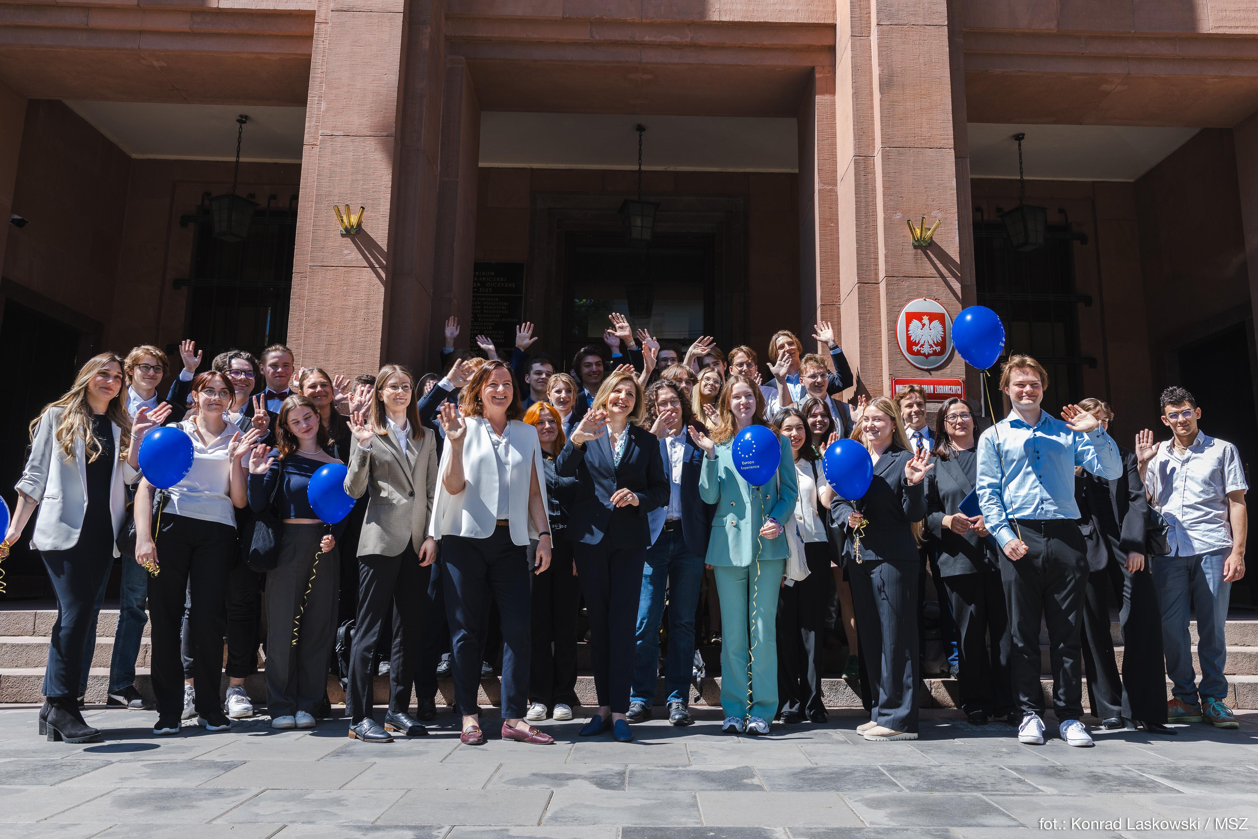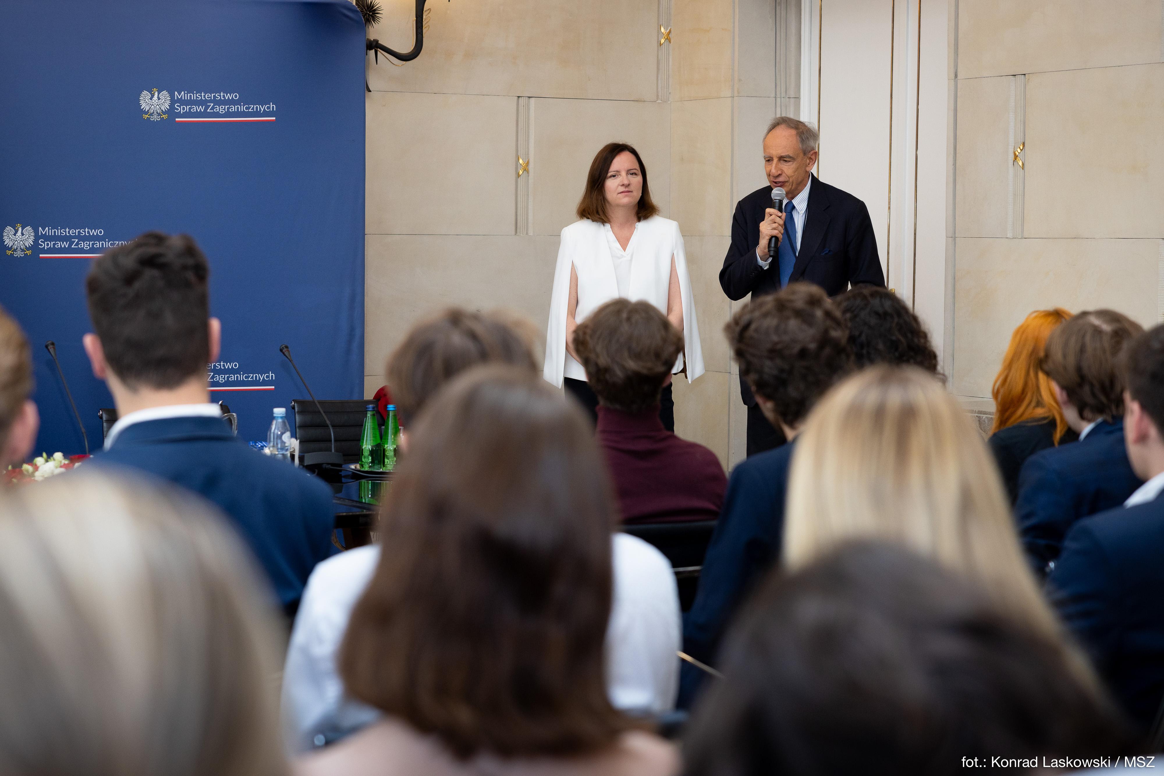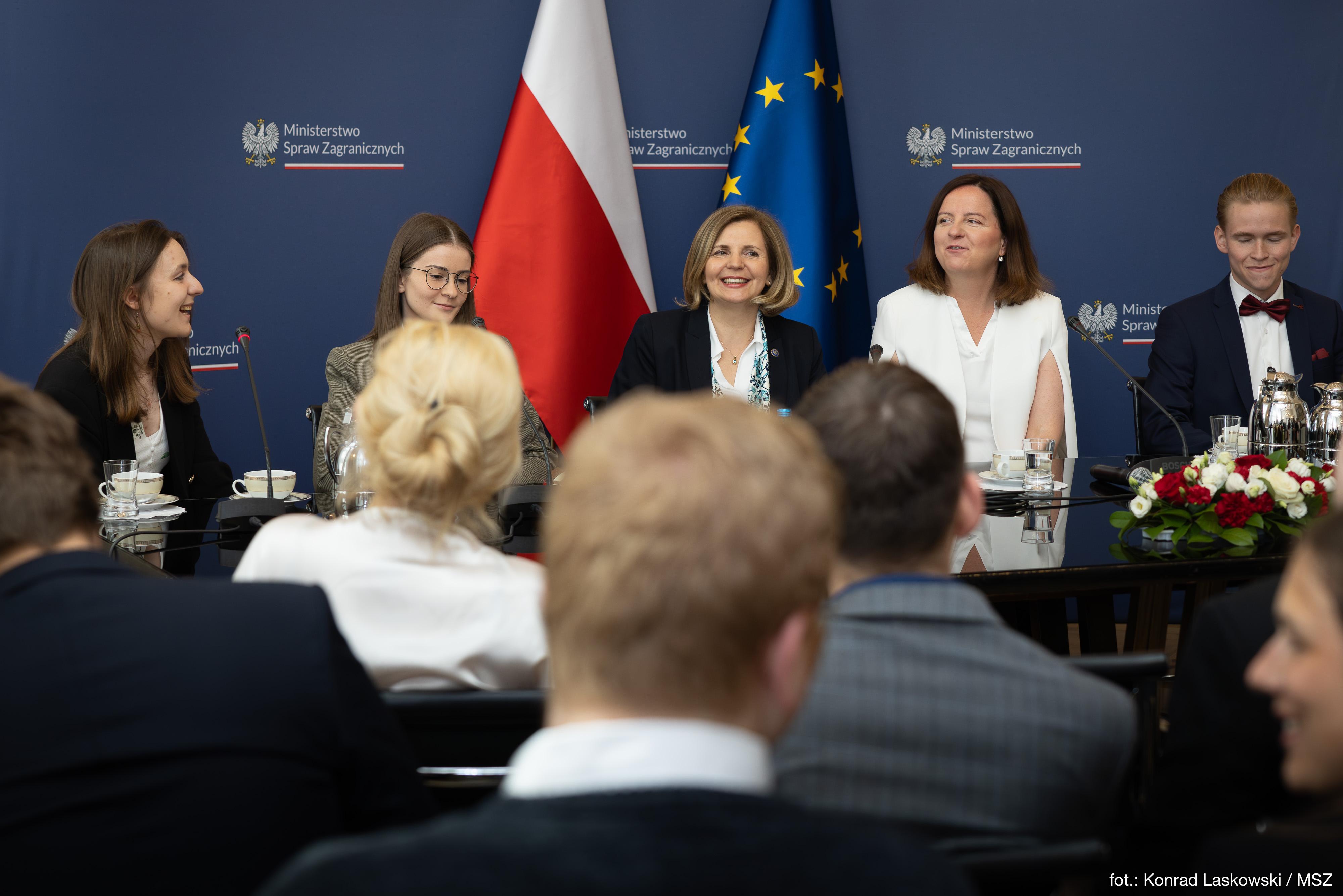 Hosted by Head of the Minister’s Political Cabinet Aleksandra Klimont-Bodzińska, the discussion addressed questions about Poland’s role in the EU structures, young people’s expectations of the European Union, the challenges ahead of the member states in the context of the current international situation, and the upcoming elections to the European Parliament.