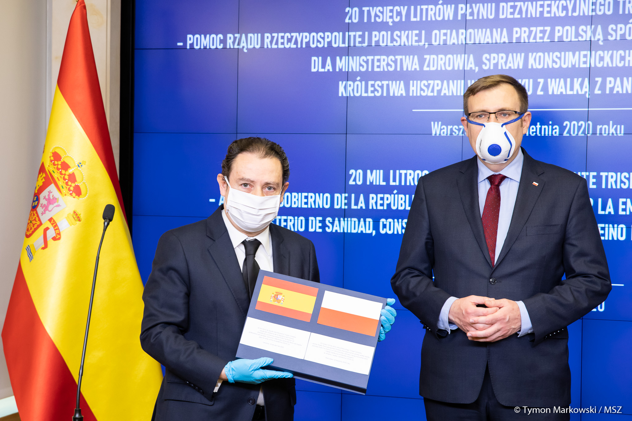 “In times when all nations grapple with exceptional difficulties, what we need most is solidarity. I believe that mutual support will allow us to endure the hard times and hurry up the end of the COVID-19 crisis," said Deputy Minister Marcin Przydacz during a ceremony to donate medical supplies to Spain. The ceremony was attended by the Ambassador of the Kingdom of Spain to Poland Francisco Javier Sanabria Valderrama.