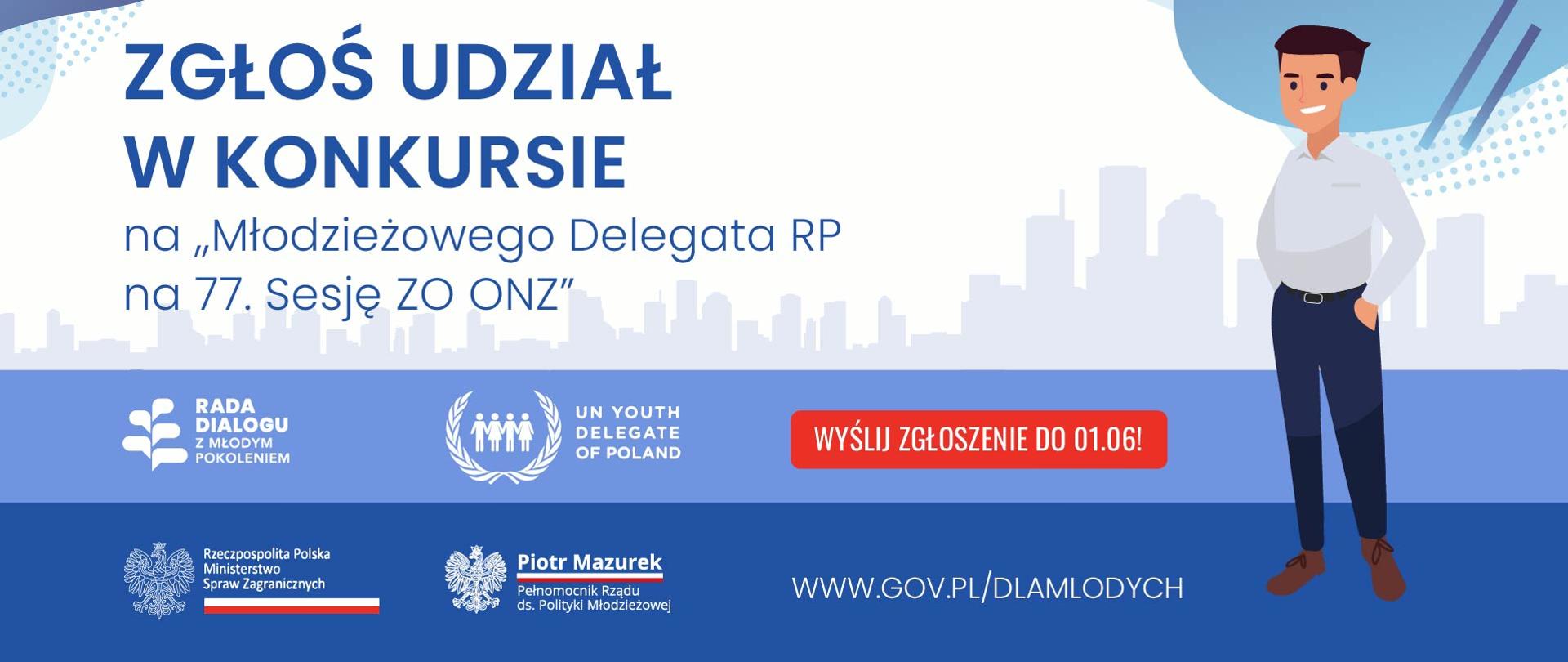 Rada Dialogu z Młodym Pokoleniem przy współpracy z MSZ ogłasza konkurs „Młodzieżowy Delegat RP na 77. Sesję ZO ONZ”. Jego celem jest wyłonienie osoby, która w charakterze Młodzieżowego Delegata RP weźmie udział w 77. Sesji Zgromadzenia Ogólnego Organizacji Narodów Zjednoczonych oraz będzie uczestniczyła w realizacji i upowszechnianiu założeń Konkursu do kolejnej Sesji Zgromadzenia Ogólnego ONZ.