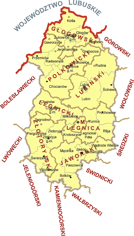 - Powiatu polkowickiego obejmującego gminy: Chocianów, Gaworzyce, Grębocice, Polkowice, Przemków, Radwanice.