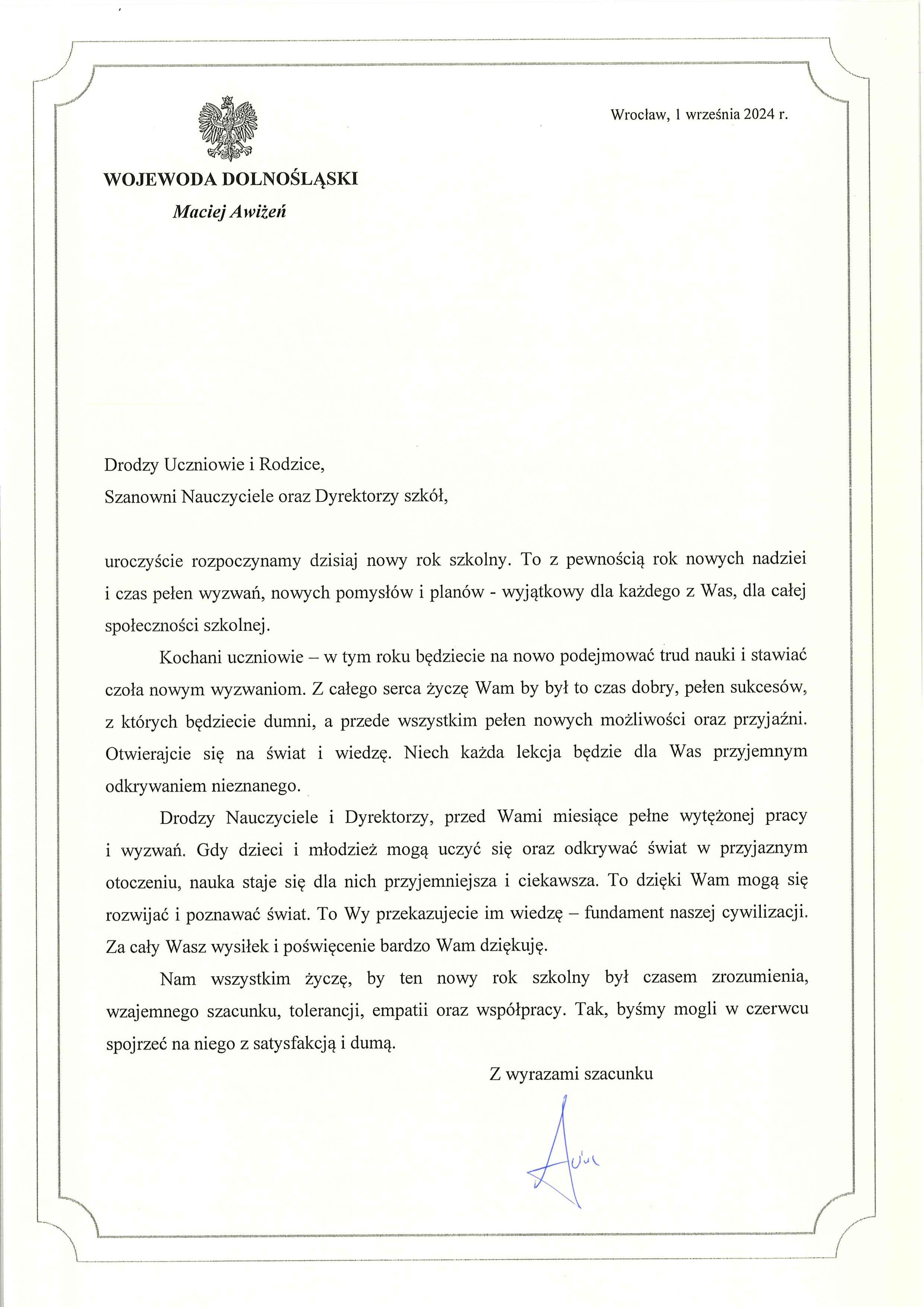 W swoim liście do licznie zgromadzonych uczniów, rodziców i nauczycieli Wojewoda Dolnośląski napisał: