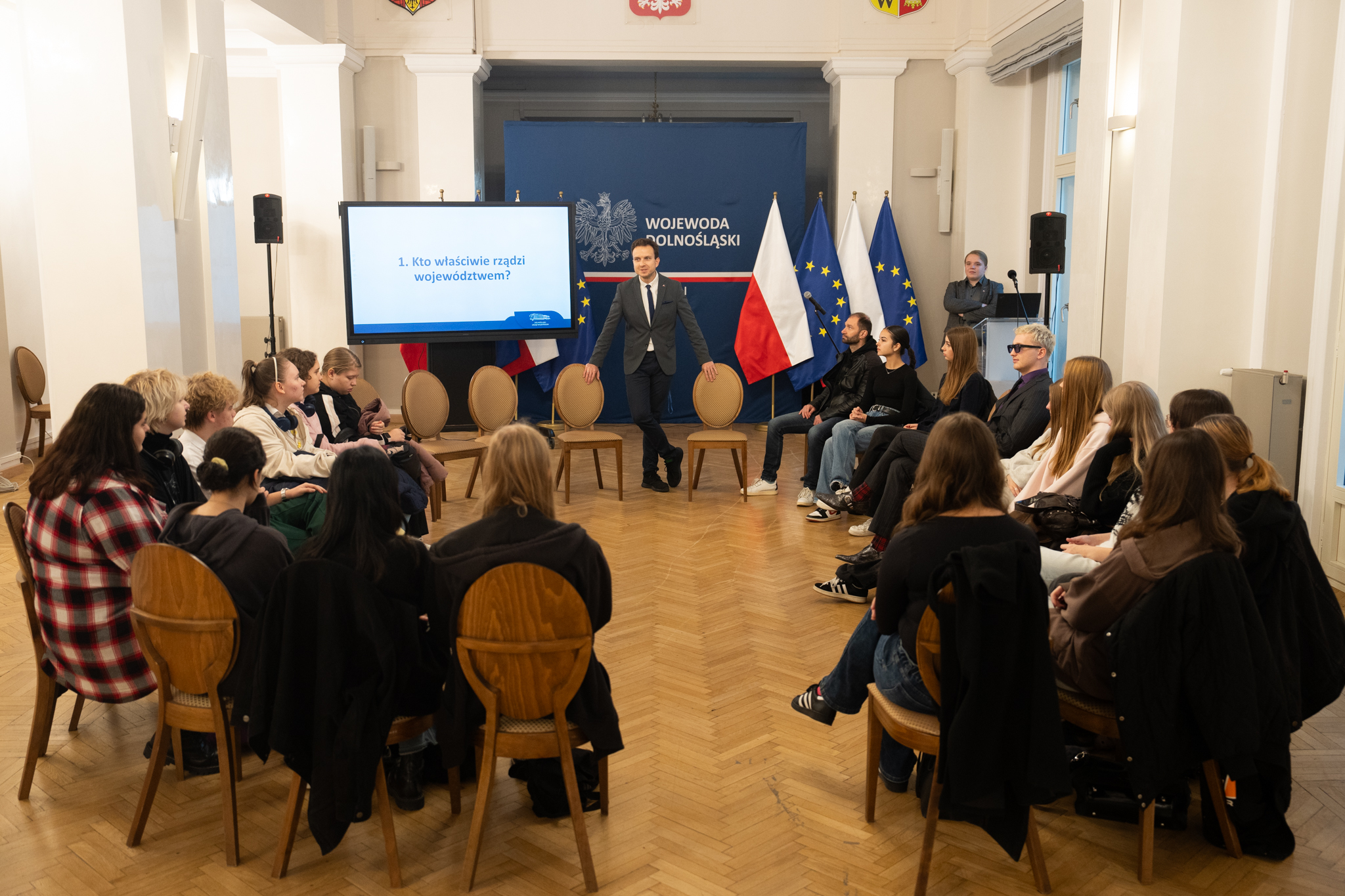 Lekcja na temat funkcjonowania administracji, poprowadzona przez Wicewojewodę Dolnośląskiego dr Piotra Sebastiana Kozdrowickiego.