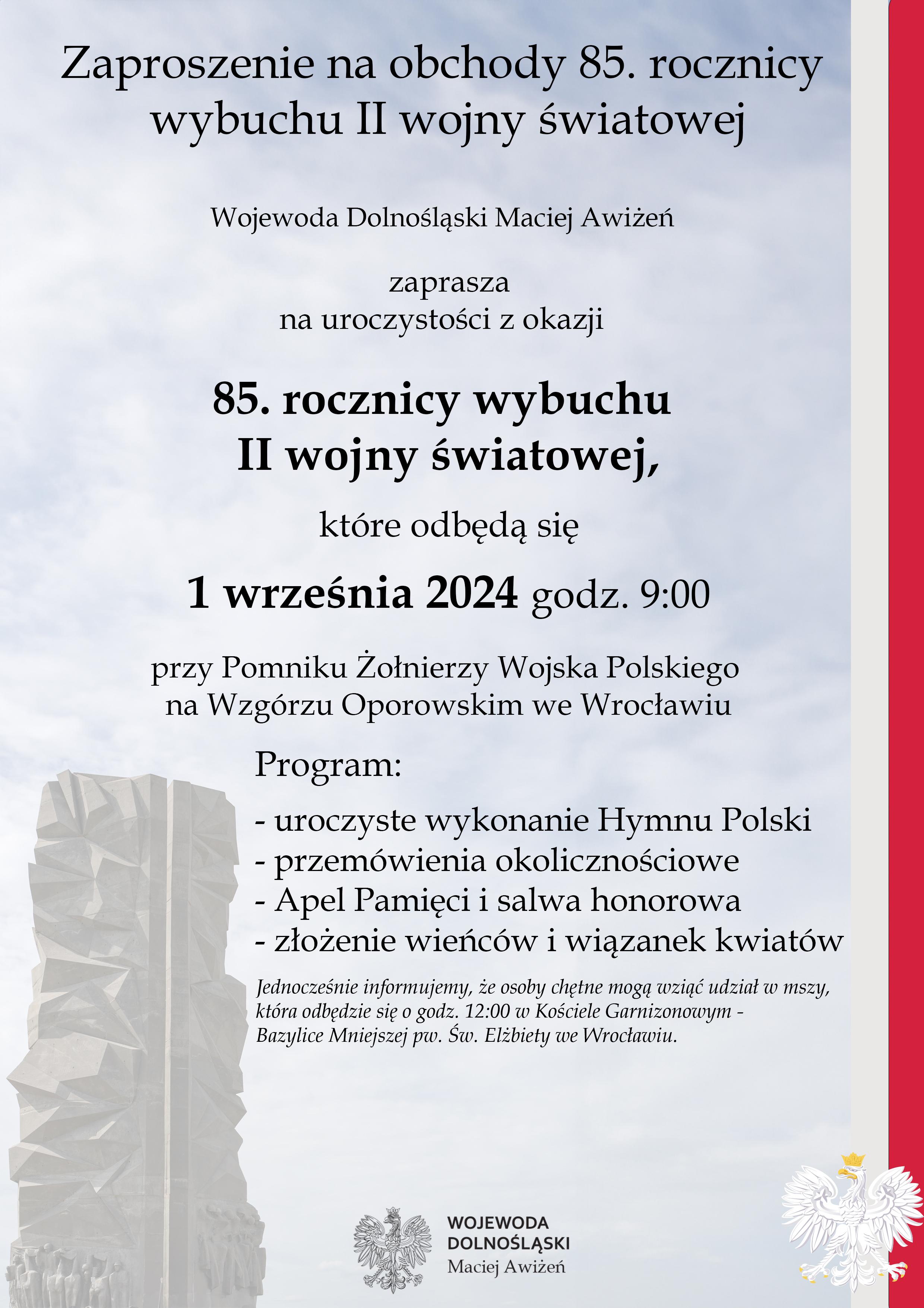 Zaproszenie na uroczystość upamiętnienia 85. rocznicy wybuchu II wojny światowej