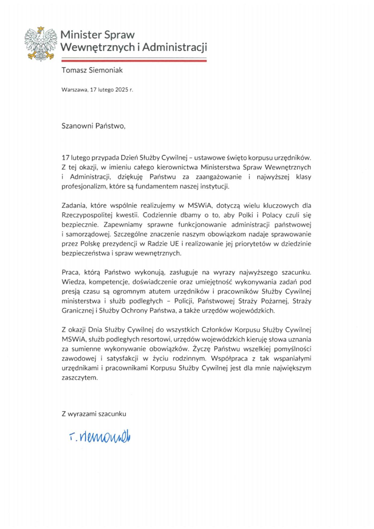 Życzenia pana ministra Tomasza Siemoniaka z okazji Dnia Służby Cywilnej