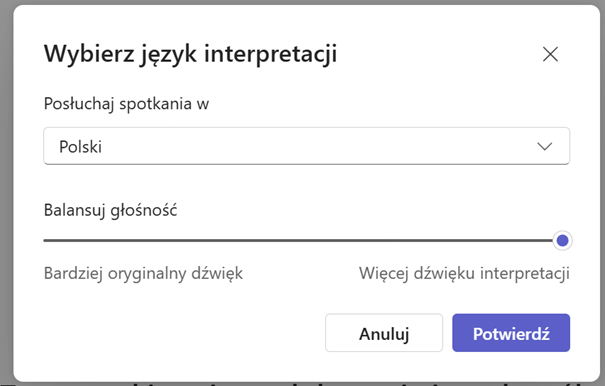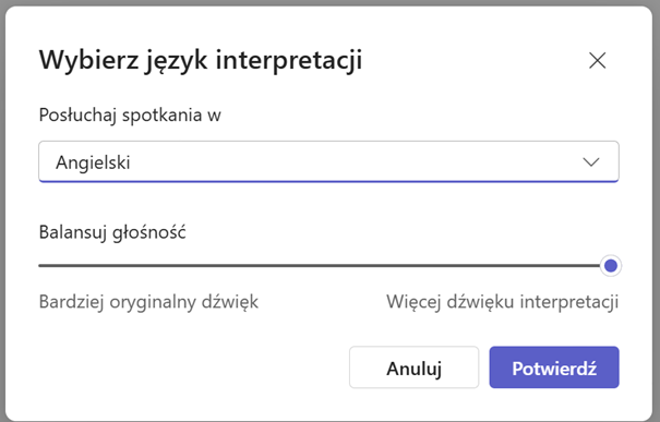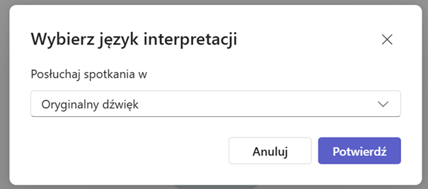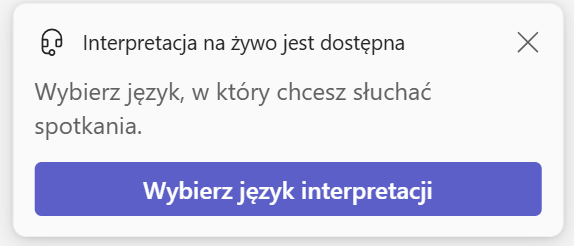 - Gdy klikniesz link, który łączy uczestnika z konferencją, wyświetli się okno z komunikatem: „Interpretacja na żywo jest dostępna. Wybierz język, w którym chcesz słuchać spotkania” oraz przycisk: „Wybierz język interpretacji”.