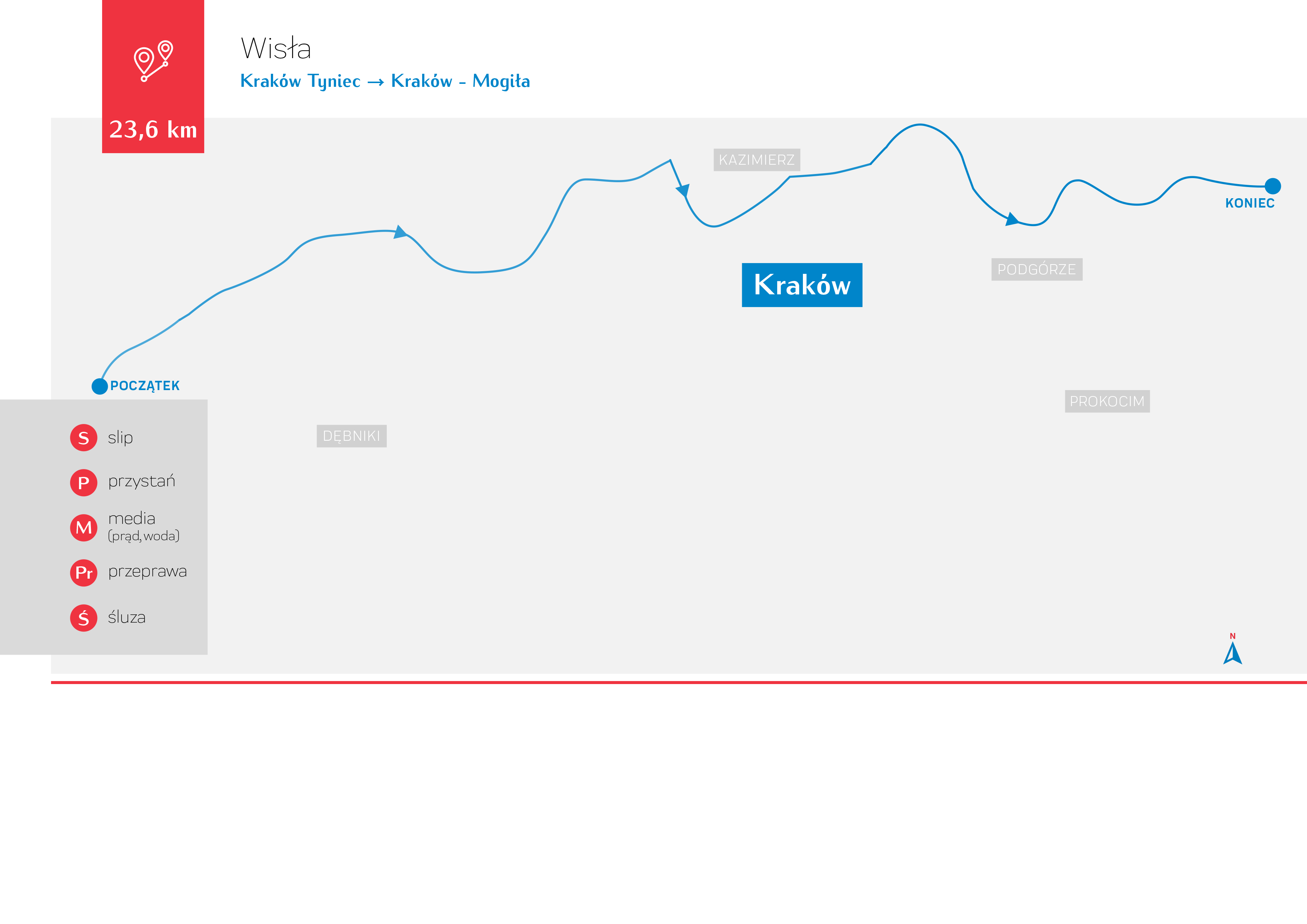 Trasa rzeką Wisłą na odcinku Tyniec – Nowa Huta przewiduje pokonanie dwóch stopni wodnych (Kościuszko, Dąbie).