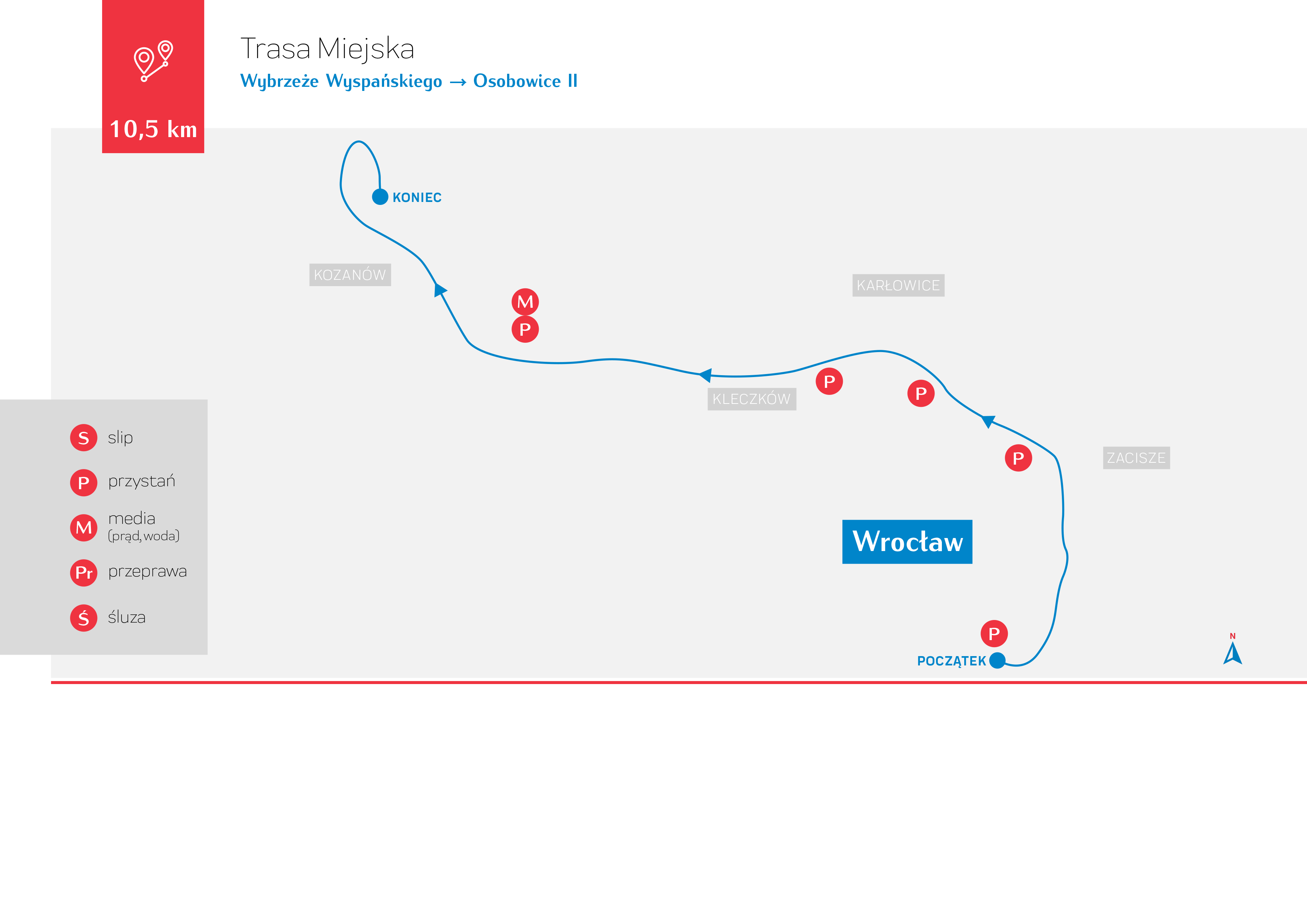 Wyruszamy w rejs spod gmachu Politechniki Wrocławskiej przy Wybrzeżu Wyspiańskiego i kierujemy się w stronę Śluzy Szczytniki. Jest to droga wodna na rzece Odrze, która umożliwia wypłyniecie oraz wpłynięcie do Wrocławia z pominięciem centrum miasta i Śródmiejskiego Węzła Wodnego. Poprowadzona Starą Odrą oraz Kanałem Miejskim. Szlak ten wykorzystywany jest do celów turystycznych i rekreacyjnych. Na swojej drodze płynąc w dół rzeki spotykamy przeprawy mostowe Most Zwierzyniecki oraz Szczytnicki. Przed Mostem Zwierzynieckim znajduje się przystań o tej samej nazwie przy której można się zatrzymać. Powyżej tej przystani znajduje się jedna z najciekawszych atrakcji Wrocławia. Jest nim Ogród Zoologiczny. Najstarszy, a jednocześnie najnowocześniejszy w całej Polsce, który znacznie wyprzedza inne tego typu placówki po otwarciu Afrykarium. W sąsiedztwie Ogrodu Zoologicznego znajduje się unikatowe miejsce na mapie Polski, Obiekt Światowego Dziedzictwa UNESCO Hala Stulecia, wraz z najstarszym parkiem wrocławskim, Parkiem Szczytnickim oraz znajdującym się w nim Ogrodzie Japońskim. Po powrocie do kajaka kontynuujemy swoją podróż i kierujemy się w stronę Kanału Miejskiego przepływając Most Burzowy. Wzdłuż kanału mamy możliwość skorzystania z nabrzeży Browaru Piastowskiego czy przy elewatorze zatrzymując się na odpoczynek, zwiedzanie czy chociażby podziwianie panoramy miasta. Na końcu kanału znajduje się Śluza Miejska, po przepłynięciu której kontynuujemy naszą podróż w dół rzeki Odry. Jest to odcinek rzeki Odry, gdzie odbywa się transport ładunków statkami żeglugi śródlądowej. Po lewej stronie mijamy nabrzeże przeładunku węgla Elektrociepłowni. Po przepłynięciu kilkuset metrów od tego miejsca przed Mostem Kolejowym zauważymy rozgałęzienie, które prowadzi do dawnego Portu Miejskiego, Elektrowni oraz umożliwia wpłynięcie do Wrocławia. Jednak my płyniemy prosto pod Mostem Kolejowym, a następnie pod Milenijnym. Tuż za mostem na lewym brzegu znajduje się dawne zimowisko barek Osobowice II do którego wpływamy. Jest to ostatni punkt naszej podróży.