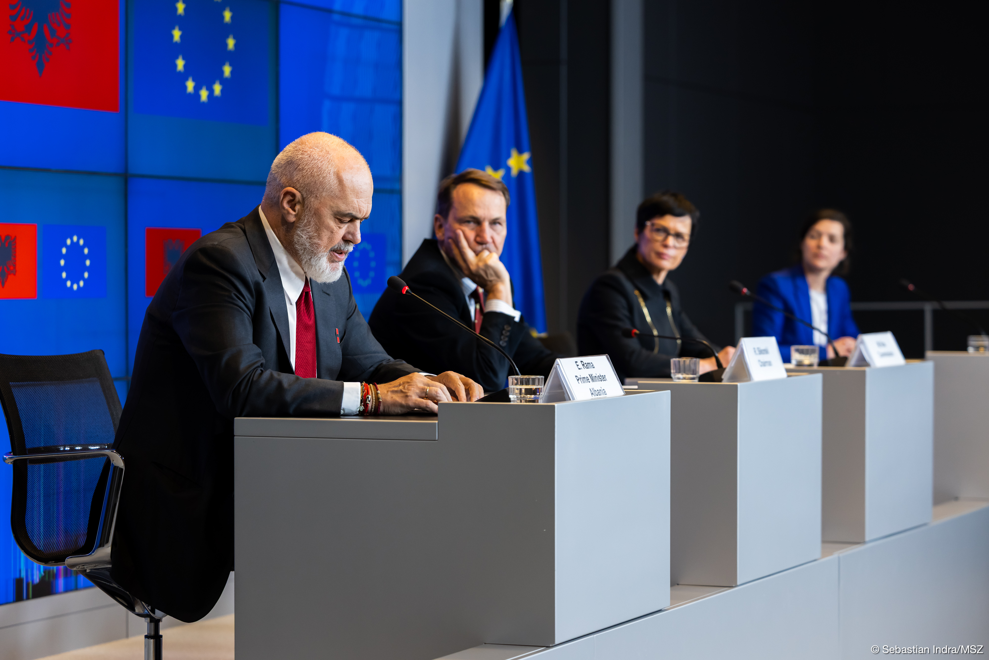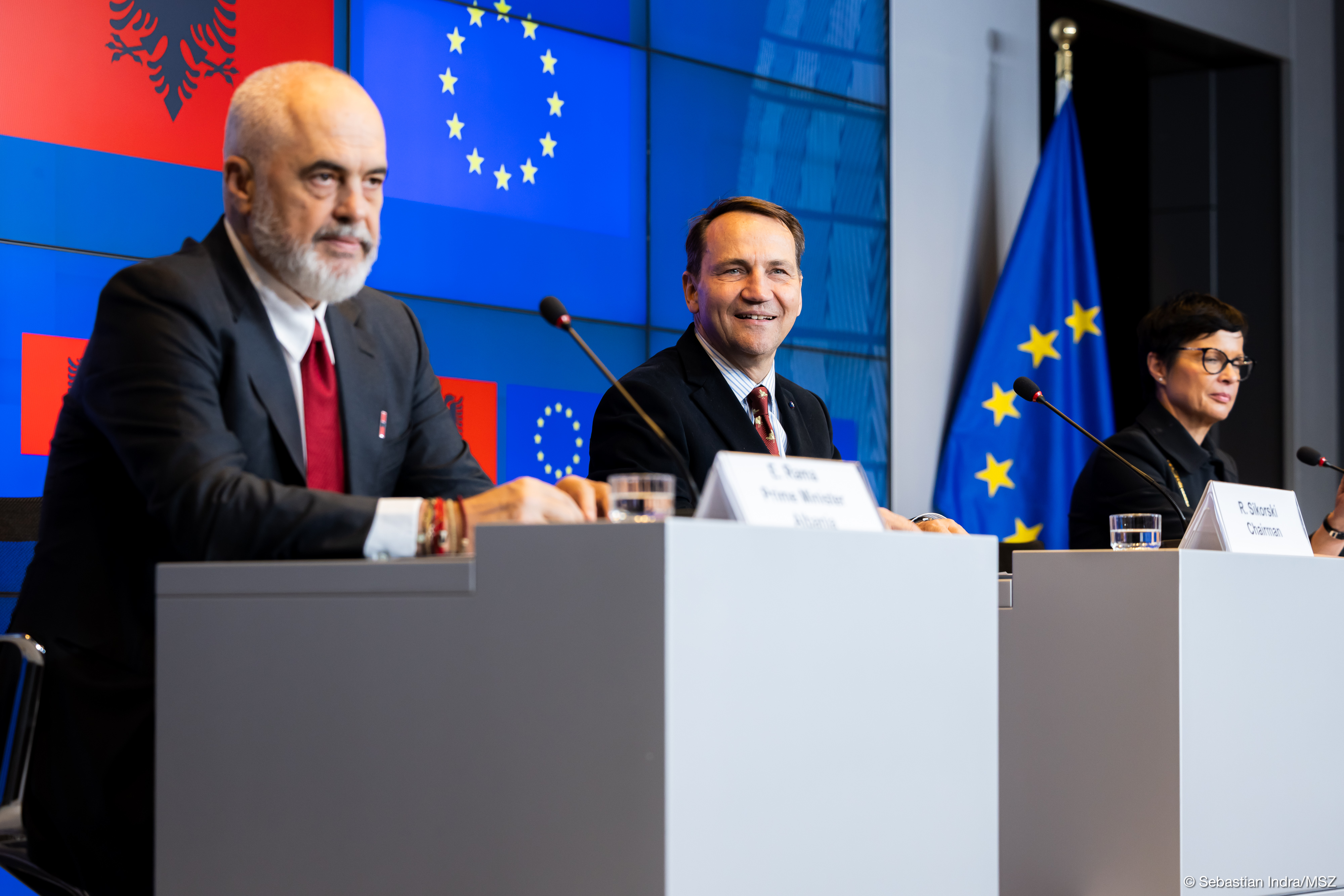 Minister Sikorski, w imieniu polskiej prezydencji w Radzie Unii Europejskiej, przewodniczył delegacji unijnej. Komisarz ds. rozszerzenia Marta Kos reprezentowała Komisję Europejską. Szefem delegacji Albanii był premier Edi Rama.