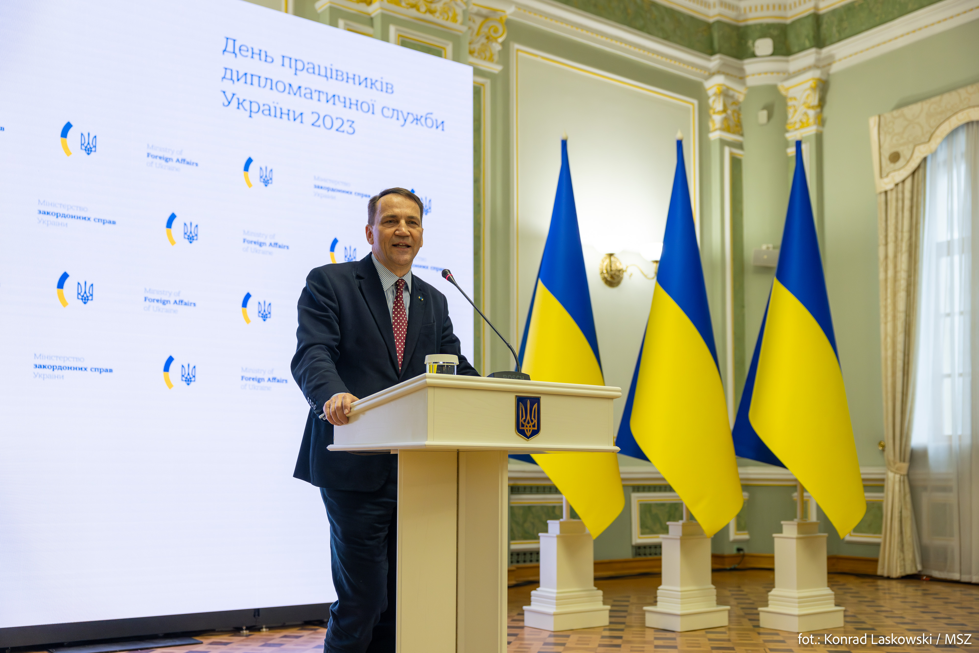 Polski minister został zaproszony do Kijowa przez ministra Kułebę, jako gość honorowy Dnia Służby Dyplomatycznej Ukrainy, gdzie wygłosił programowe przemówienie dotyczące relacji polsko-ukraińskich. W dalszej części przemówienia zarysował ponadto ogólne zasady rządzące procesem negocjacyjnym przed przystąpieniem do Unii Europejskiej. Szef polskiego MSZ ocenił też, że członkostwo Ukrainy jest potrzebne zarówno Polsce jak i całej Unii. Ze strony ukraińskiej podkreślano także zbliżającą się 10. rocznicę Rewolucji Wolności. Dziesięć lat temu polski minister wraz z ministrem spraw zagranicznych Niemiec Frankiem-Walterem Steinmeierem i Francji Lauretem Fabiusem wsparli proeuropejskie aspiracje Ukrainy i przyczynili się do powstrzymania rozlewu krwi na Majdanie