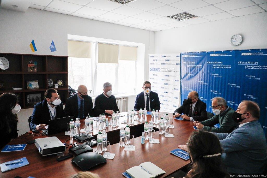 Następnie urzędujący przewodniczący OBWE odbył spotkanie z przedstawicielami OBWE na Ukrainie: szefem Specjalnej Misji Monitorującej (SMM) ambasadorem Yaşarem H. Çevikiem, Specjalnym Przedstawicielem Przewodniczącego OBWE na Ukrainie i w TGK ambasadorem Mikko Kinnunenem oraz Koordynatorem Projektów OBWE na Ukrainie ambasadorem Henrikiem Villadsenem. Podczas tych spotkań minister Rau wyraził pełne poparcie dla prac TCG i SMM oraz zaniepokojenie niedopuszczalnymi ograniczeniami w zakresie swobody przemieszczania się obserwatorów, w szczególności na niekontrolowanych przez rząd obszarach Ukrainy. Podkreślił, że utrzymujące się wyzwania skutecznie utrudniają misji wypełnianie jej mandatu.