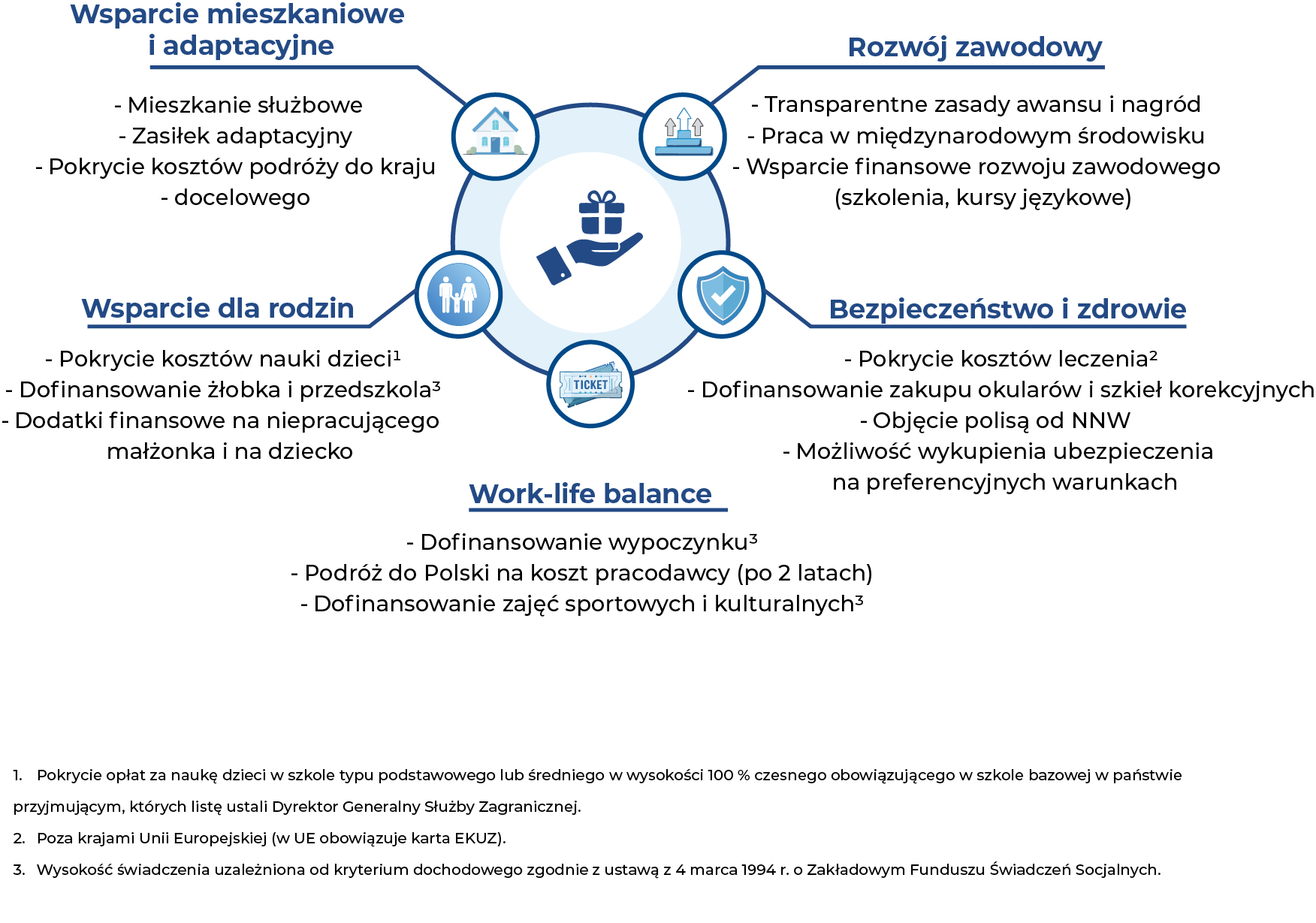 Wyjazd na placówkę wiąże się nie tylko z obowiązkami, ale także z przywilejami. To między innymi pokrycie kosztów przesiedlenia, mieszkania (wraz z opłatami za niektóre media), leczenia za granicą, nauki dzieci w szkole (w wybranych państwach - w szkole międzynarodowej) oraz dodatek na niepracującego małżonka (10% dodatku zagranicznego miesięcznie) i na dziecko (25% kwoty bazowej dodatku zagranicznego).