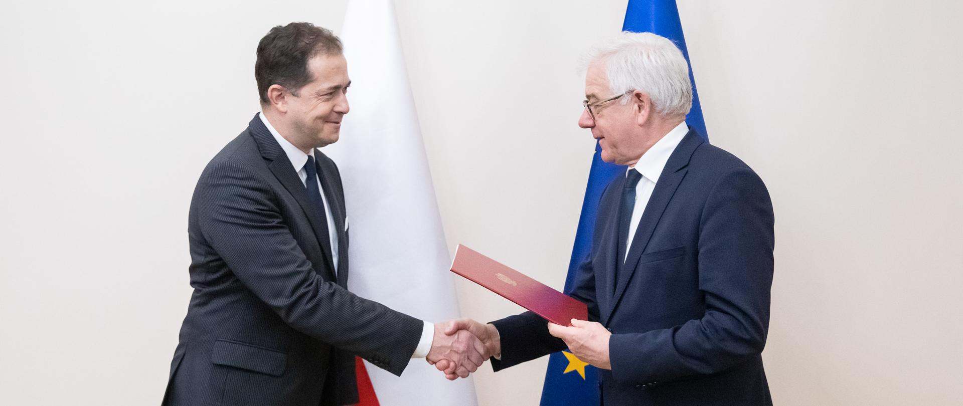 Minister Jacek Czaputowicz w imieniu Prezydenta RP wręczył dziś Pawłowi Milewskiemu nominację na stanowisko Ambasadora Nadzwyczajnego i Pełnomocnego RP w Japonii.