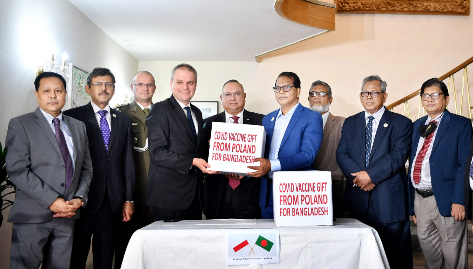 W ceremonii przyjęcia transportu w Dhace udział wzięli Ambasador RP Adam Burakowski, Attaché Obrony płk. Radosław Grabski i Honorowy Konsul Generalny RP w Dhace Reshadur Rahman. Stronę bangladeską reprezentowali p.o. ministra SZ Kadm. Khurshed Alam i wiceminister Zdrowia Lokman Hossain Miah. Bangladesz, który jest ważnym partnerem politycznym i gospodarczym Polski w regionie Azji Południowej, należy do państw o największej liczbie ludności na świecie. Na 163 mln osób, dotychczas zaszczepionych zostało zaledwie ok. 11%. Przekazanie szczepionek jest aktem solidarności we wspólnym globalnym wysiłku walki z pandemią Covid -19, która dotyka wszystkie kontynenty i społeczeństwa.