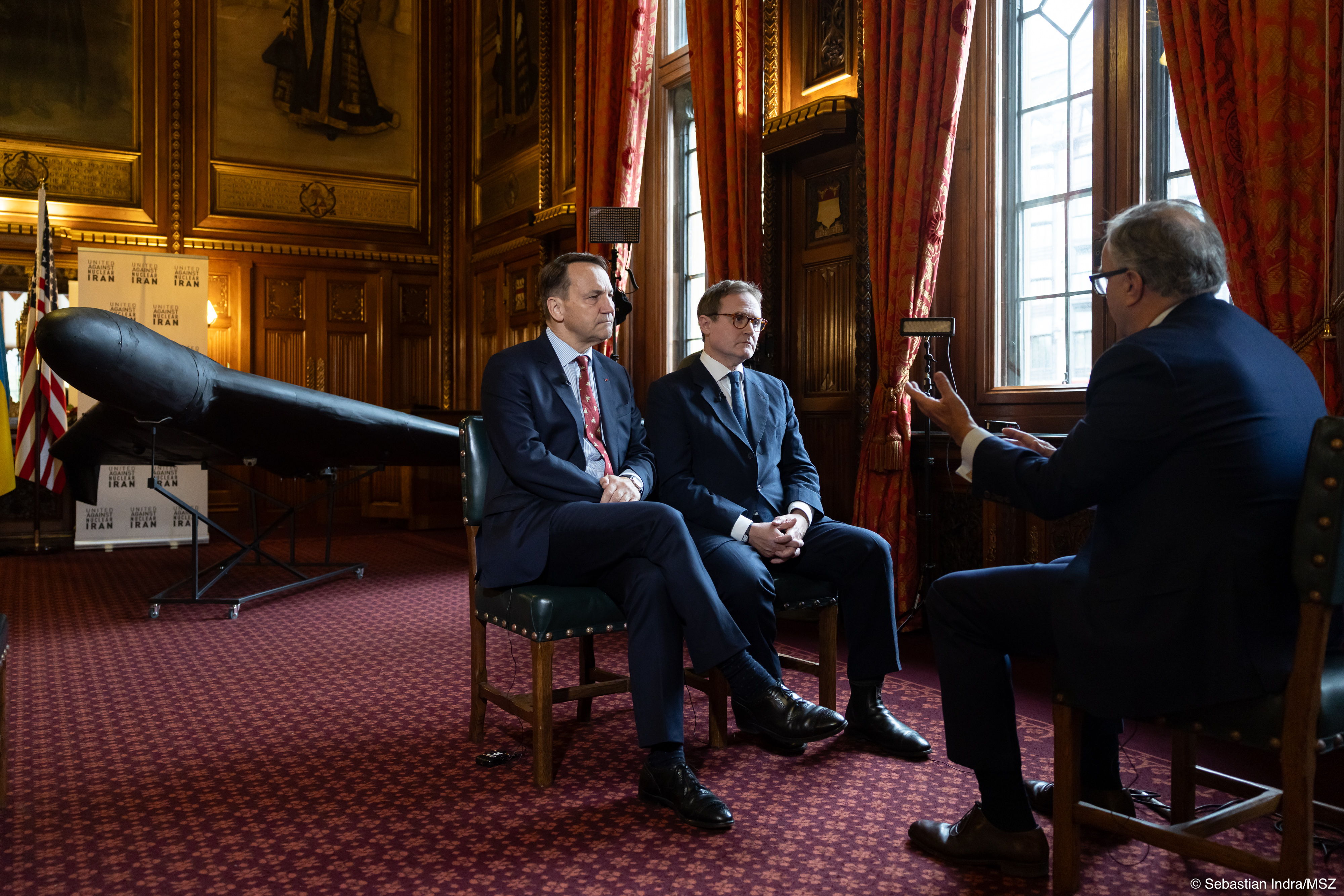 Ważnym momentem wizyty w Londynie było wystąpienie ministra Sikorskiego w Izbie Gmin, gdzie wygłosił prelekcję połączoną z prezentacją drona. Zaprezentowany dron Shahed-136 jest wykorzystywany przez Rosję przeciwko Ukrainie. Kreml za pomocą takich dronów terroryzuje Ukraińców, a przy użyciu wabików wtargnął nad polskie niebo. Do Londynu taki dron nie doleci, ale flota złomu może zniszczyć infrastrukturę krytyczną. Sikorski w swoim wystąpieniu zwrócił uwagę, że Wielka Brytania również jest ofiarą wojny hybrydowej, którą rosyjski przywódca Władimir Putin prowadzi przeciwko NATO. Sikorski podkreślił, że tylko działając razem możemy wygrać. Informował również słuchaczy, że Polska zmaga się m.in. z wysyłaniem do naszego kraju nielegalnych migrantów z Białorusi, z podpaleniami oraz atakami na instytucje finansowe i szpitale.