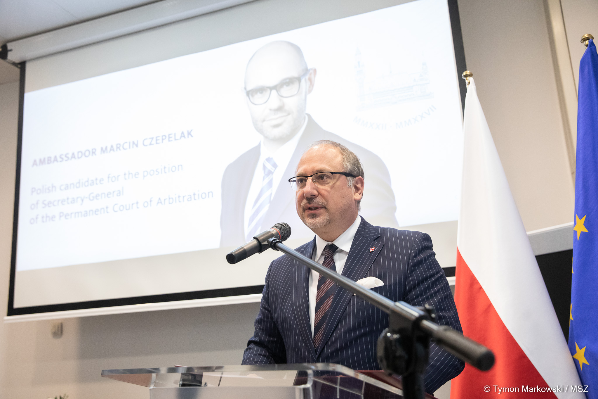 Ambasador Marcin Czepelak w swoim wystąpieniu zaprezentował cele przyświecające STA od momentu powstania do czasów współczesnych oraz przedstawił swoją wizję funkcjonowania Trybunału, zwracając szczególną uwagę na zapewnienie szerokiej akceptacji arbitrażu oraz rozszerzenie zakresu oferowanych usług.