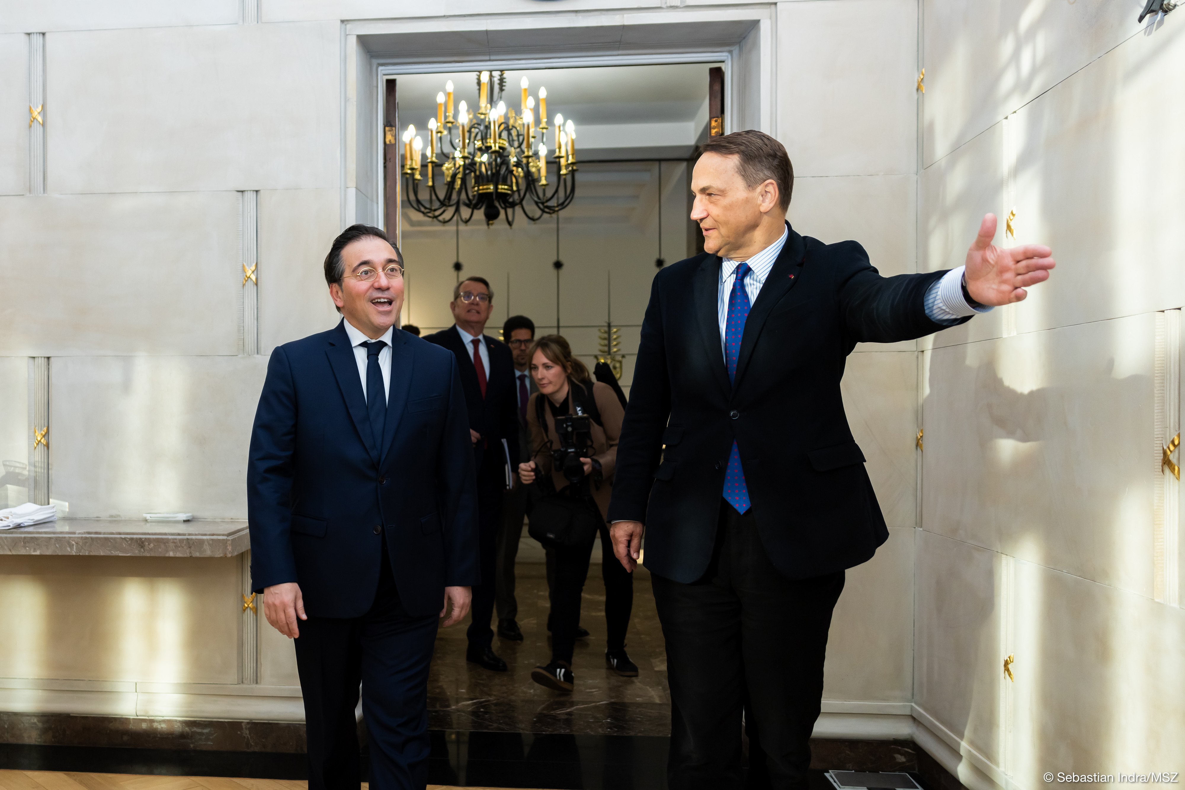 Głównymi tematami dzisiejszych rozmów ministra Radosława Sikorskiego i José Manuela Albaresa były kwestie dwustronne, priorytety polskiej prezydencji, wsparcie walczącej Ukrainy oraz współpraca z nową administracją USA.