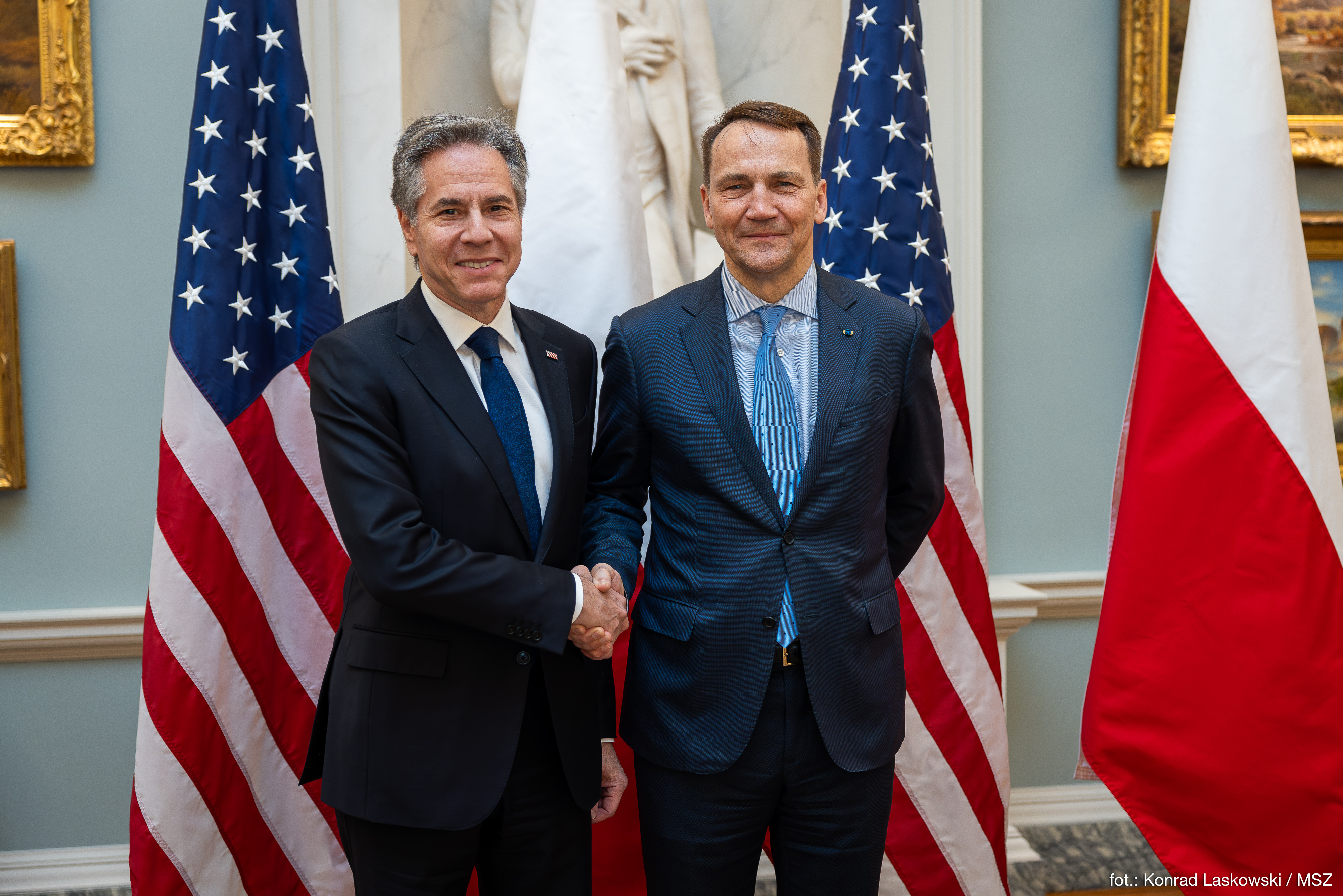 Antony Blinken podziękował Polsce za wszystko, co robi dla Ukrainy oraz za to, że stała się w Europie liderem i wzorem dla innych państw. Stwierdził, że relacje polsko-amerykańskie nigdy nie były tak dobre, a także pogratulował Radosławowi Sikorskiemu jego wystąpienia w Radzie Bezpieczeństwa ONZ, stwierdzając, że należy walczyć z rosyjską dezinformacją. Z polskiej strony minister Sikorski nakreślił obecną sytuację Ukrainy, wskazał na konieczność natychmiastowej pomocy militarnej, podkreślając że państwa europejskie wydały na pomoc Ukrainie więcej niż USA, ale nie są w stanie szybko zapewnić dostaw niezbędnego uzbrojenia. Mówiąc o zbliżającej się wizycie prezydenta i premiera powiedział, że w Polsce kohabitacja bywa trudna, ale w kwestiach obronności i spraw zagranicznych panuje pełna zgoda. Antony Blinken i Radosław Sikorski wyrazili radość z decyzji parlamentu węgierskiego, który ratyfikował przystąpienie Szwecji do Sojuszu Północnoatlantyckiego. 2 lata po inwazji rosyjskiej Unia Europejska staje się silniejsza i NATO staje się silniejsze, co podkreślił Antony Blinken.