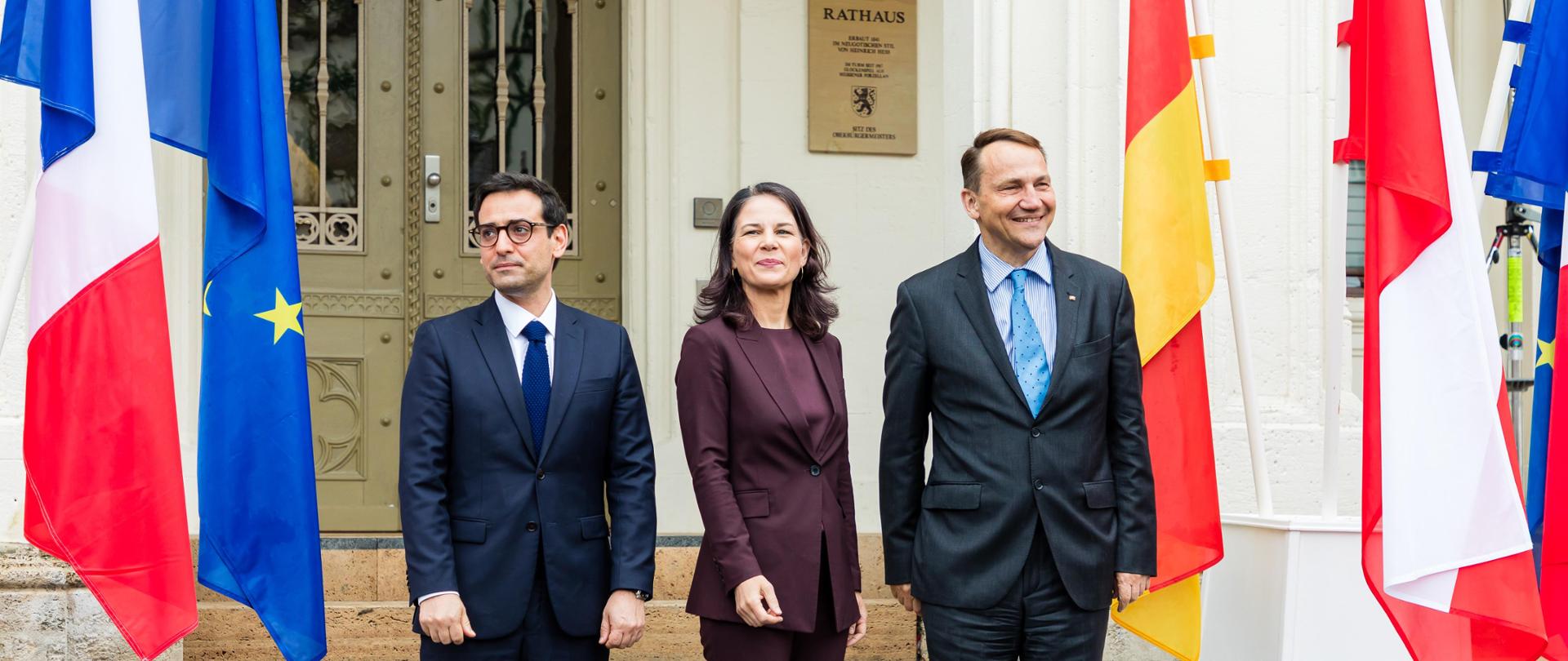 Minister Radosław Sikorski wraz ze swoimi odpowiednikami z Francji i Niemiec - Stéphanem Séjourné oraz Annaleną Baerbock, spotkali się 22 maja br. w Weimarze, by omówić stan implementacji swojej deklaracji przyjętej w La Celle-Saint-Cloud 12 lutego 2024 r. oraz szereg bieżących tematów z agendy międzynarodowej.