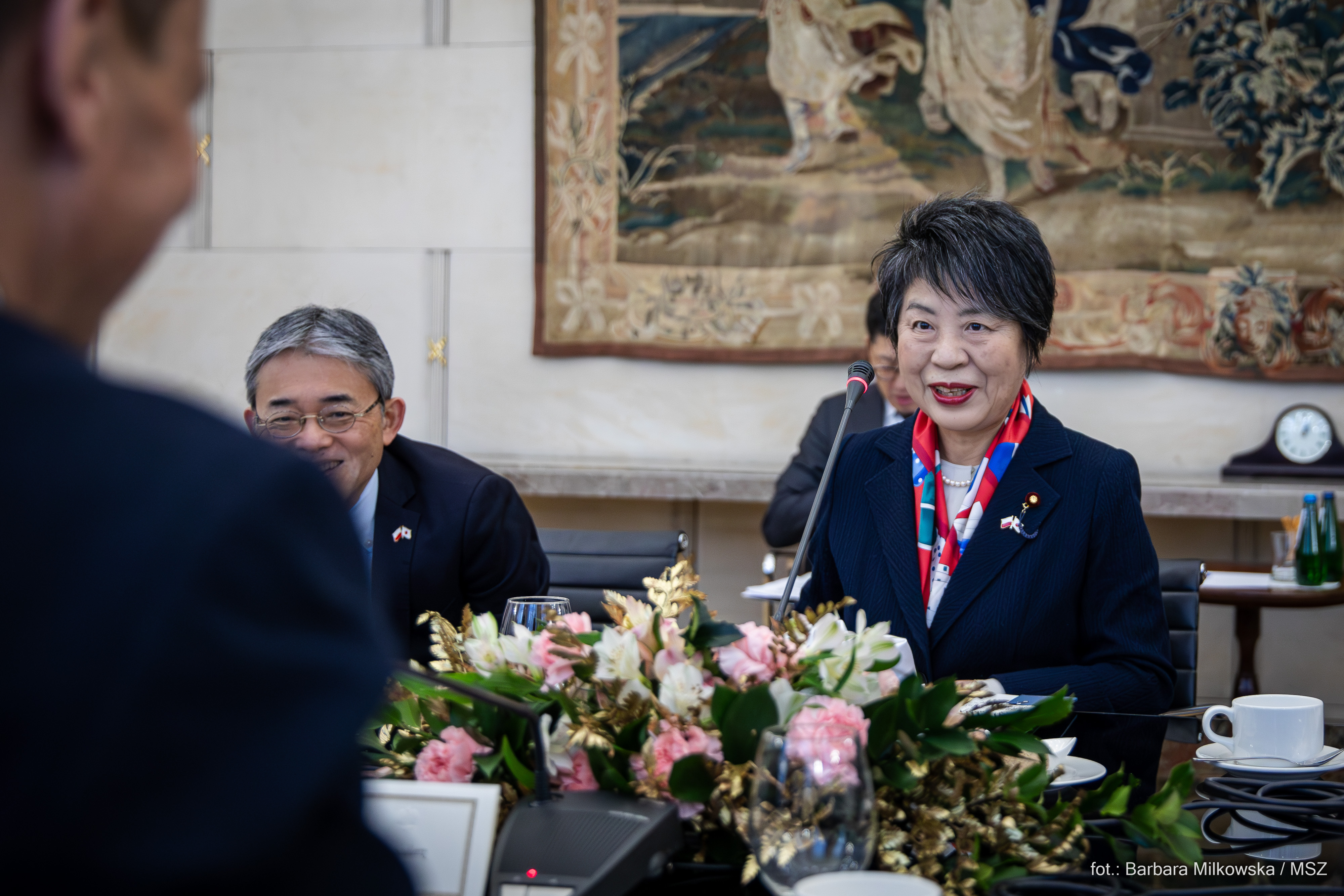 Minister Kamikawa podkreśliła rolę Polski w działaniach na rzecz wsparcia Ukrainy i zadeklarowała chęć współpracy z polskimi przedsiębiorcami w przyszłej odbudowie tego kraju.