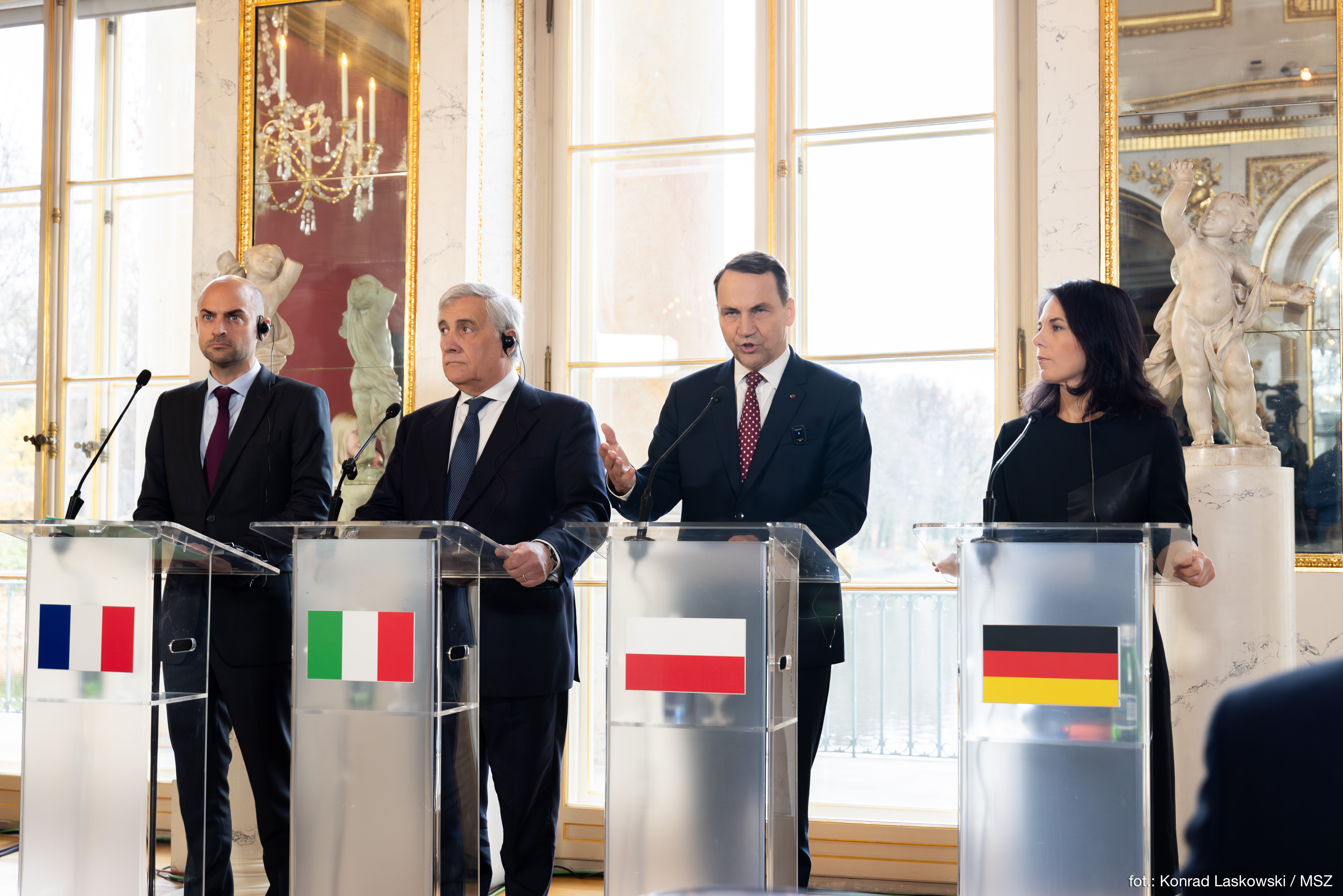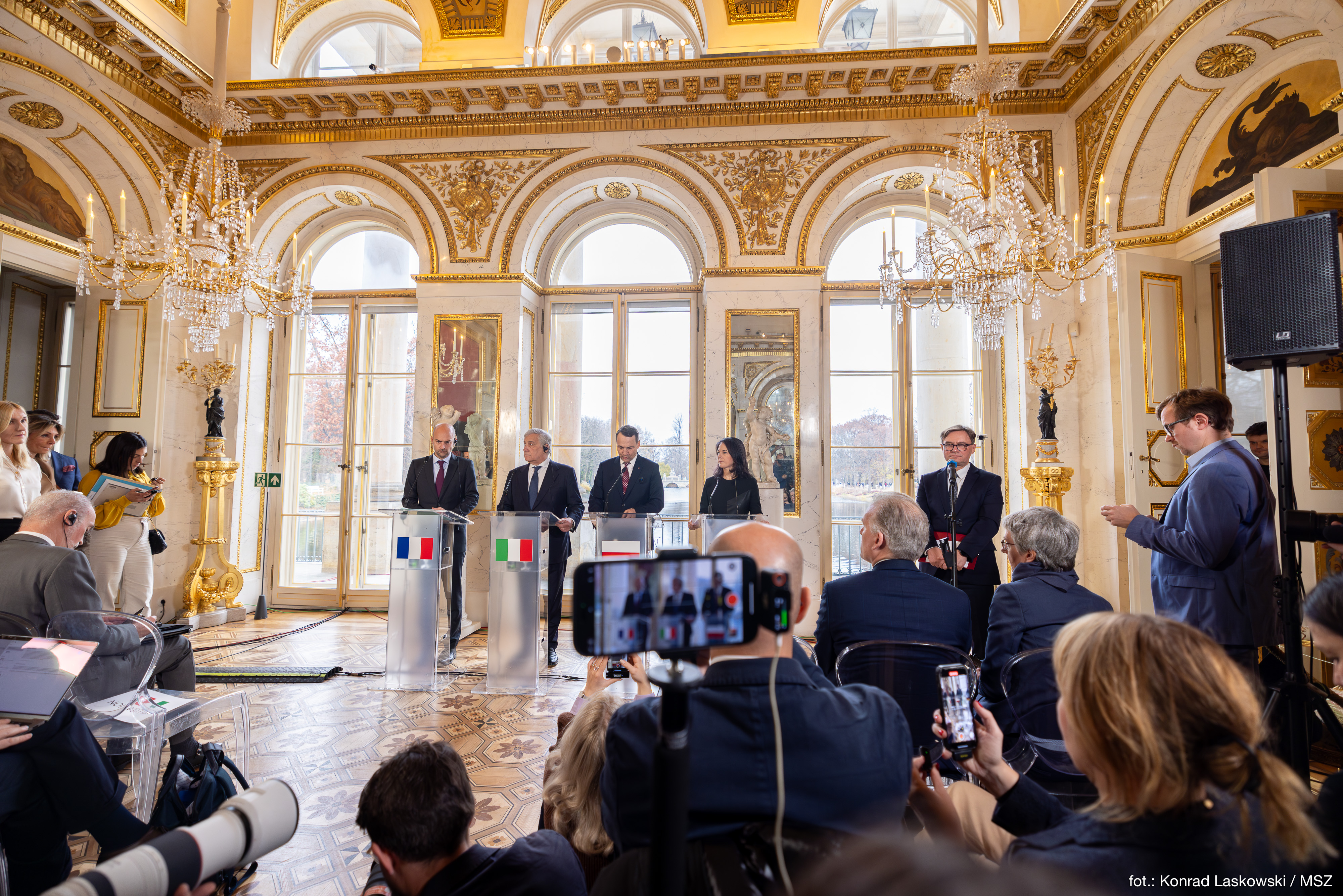 Wsparcie dla Ukrainy oraz rozwój relacji transatlantyckich – to tematy, które zdominowały dzisiaj rozmowy Ministrów Spraw Zagranicznych: Polski, Niemiec, Francji, Włoch i Hiszpanii, czyli tzw. „Wielkiej Piątki Unii Europejskiej” oraz Wielkiej Brytanii, które odbyły się w hybrydowej formule w Pałacu na Wyspie. Do Warszawy przybyli osobiście szefowie dyplomacji Włoch, Niemiec i Francji oraz Kaja Kallas, przyszła Wysoka Przedstawiciel UE do Spraw Zagranicznych i Polityki Bezpieczeństwa. Zdalnie w spotkaniu uczestniczyli Ministrowie Spraw Zagranicznych Hiszpanii i Wielkiej Brytanii.