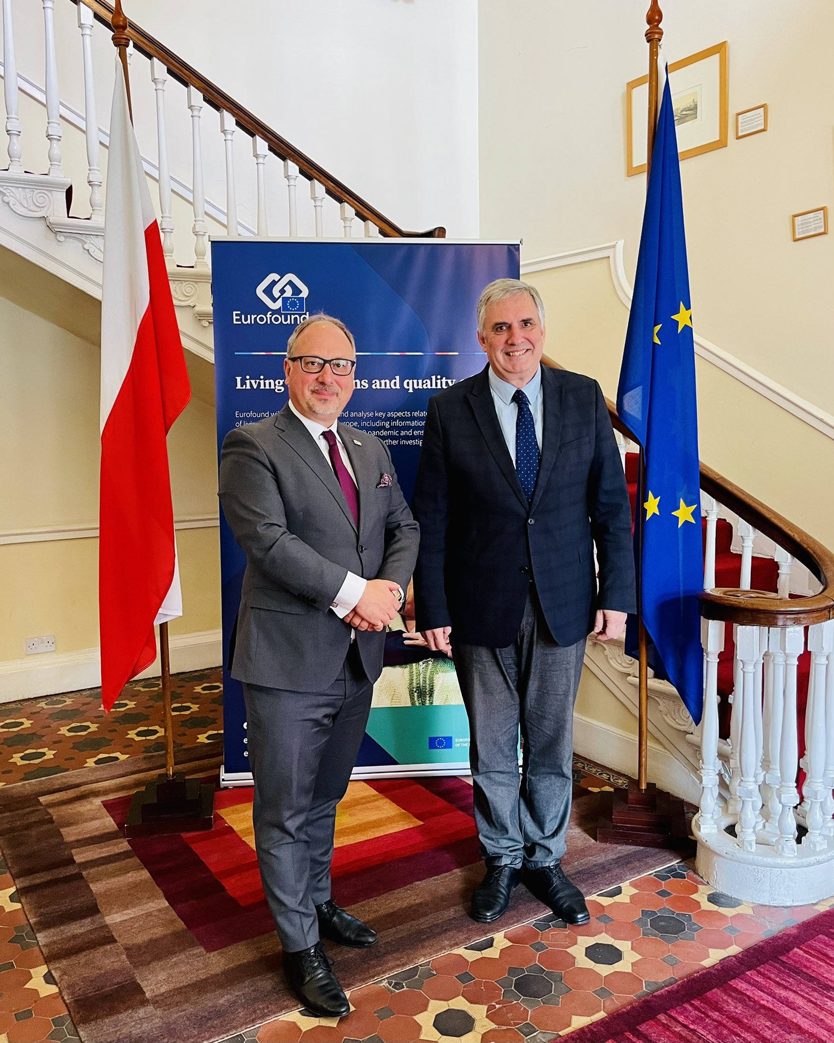 Szef Służby Zagranicznej spotkał się także z Ivailo Kalfin, Dyrektorem Europejskiej Fundacji na Rzecz Poprawy Warunków Życia i Pracy (Eurofound), by porozmawiać o konsekwencjach społeczno-gospodarczych wywołanych pandemią COVID-19 oraz działaniach mających na celu złagodzenie jej skutków w sferze polityki społecznej i zatrudnienia w UE. Podczas spotkania w siedzibie Eurofound Szef Służby Zagranicznej wyraził zainteresowanie zwiększeniem zatrudnienia polskich obywateli w instytucjach europejskich, w tym w Eurofunduszu, podkreślając, że polscy eksperci mogą stanowić wartość dodaną do pracy organizacji, jak również innych podmiotów UE.