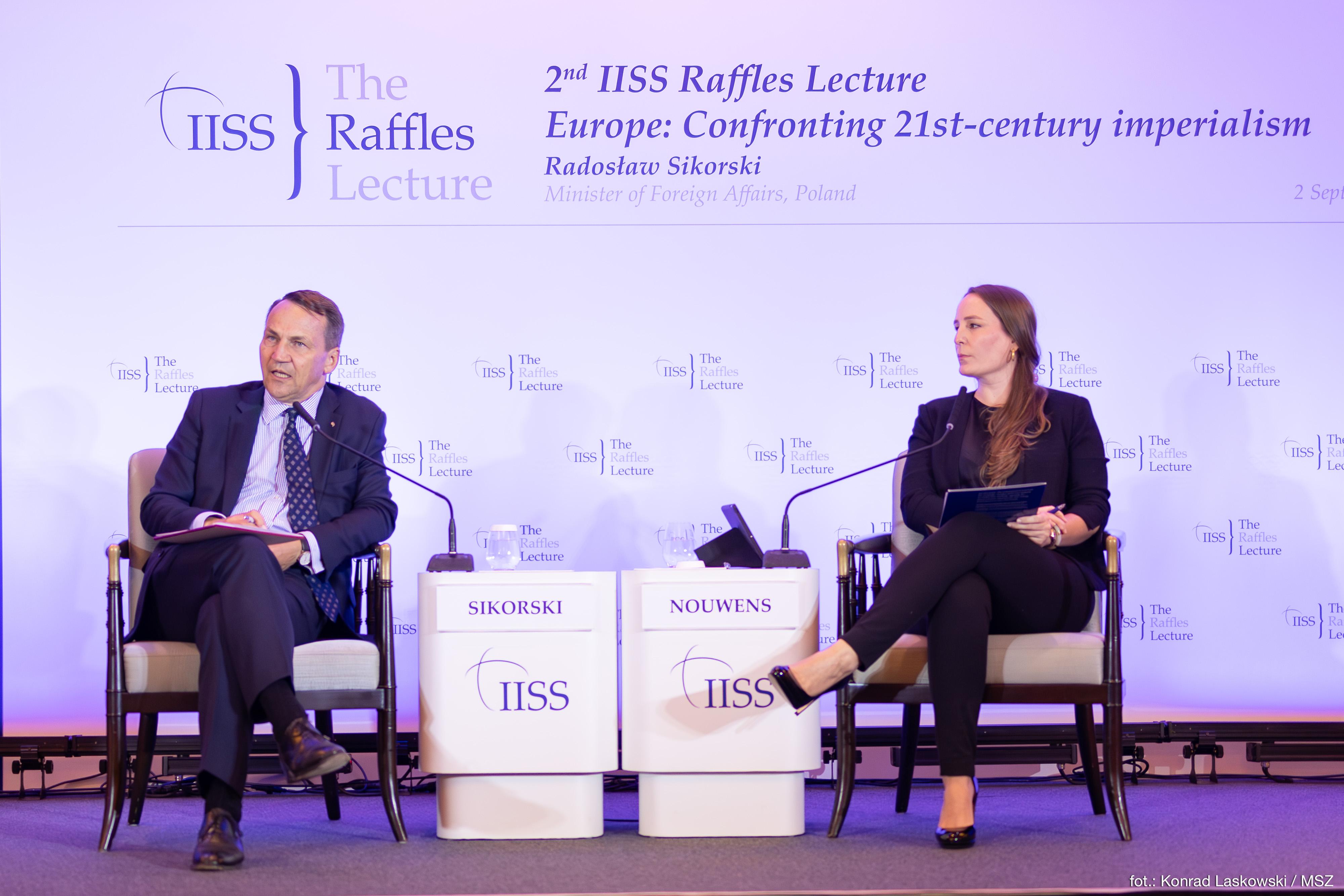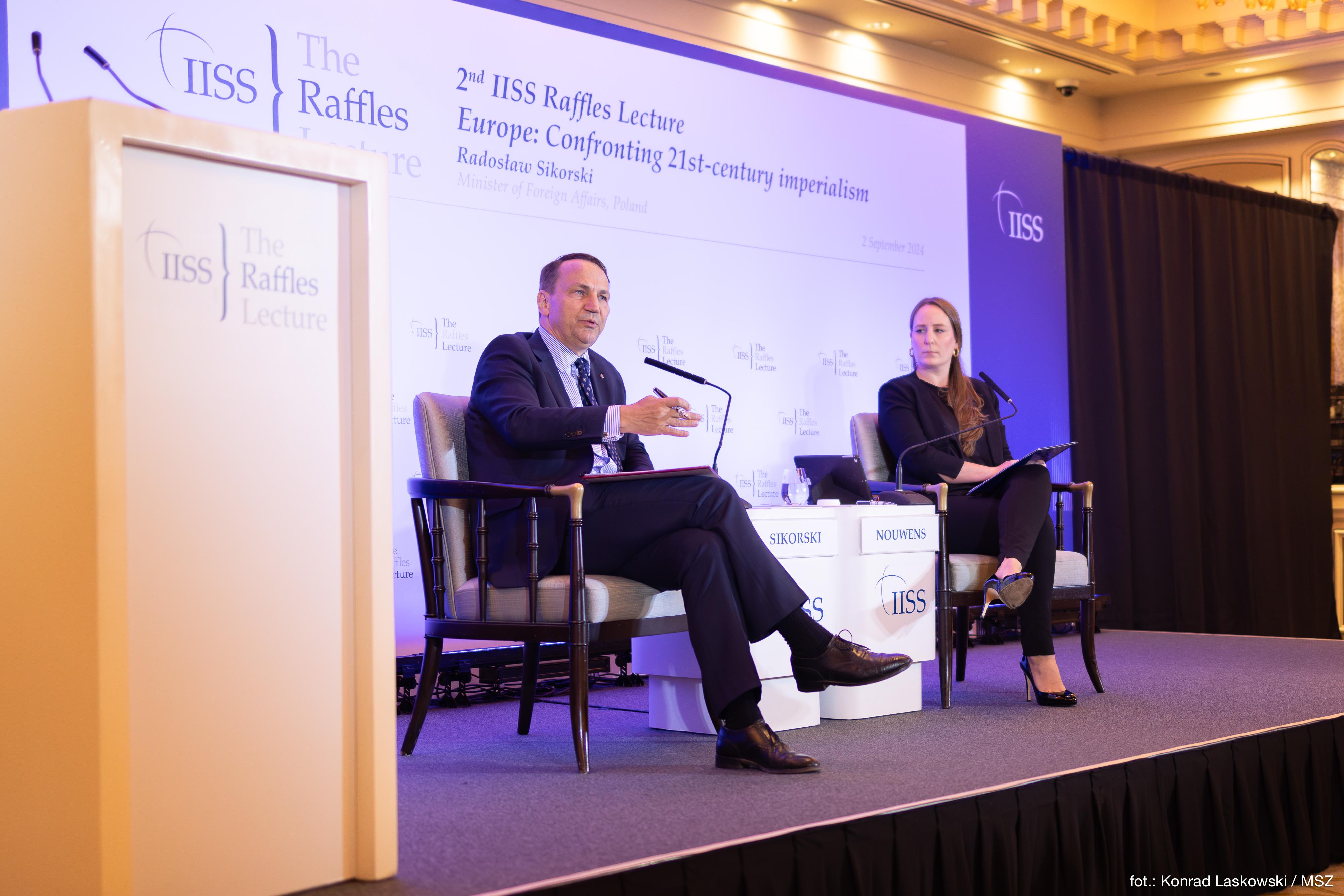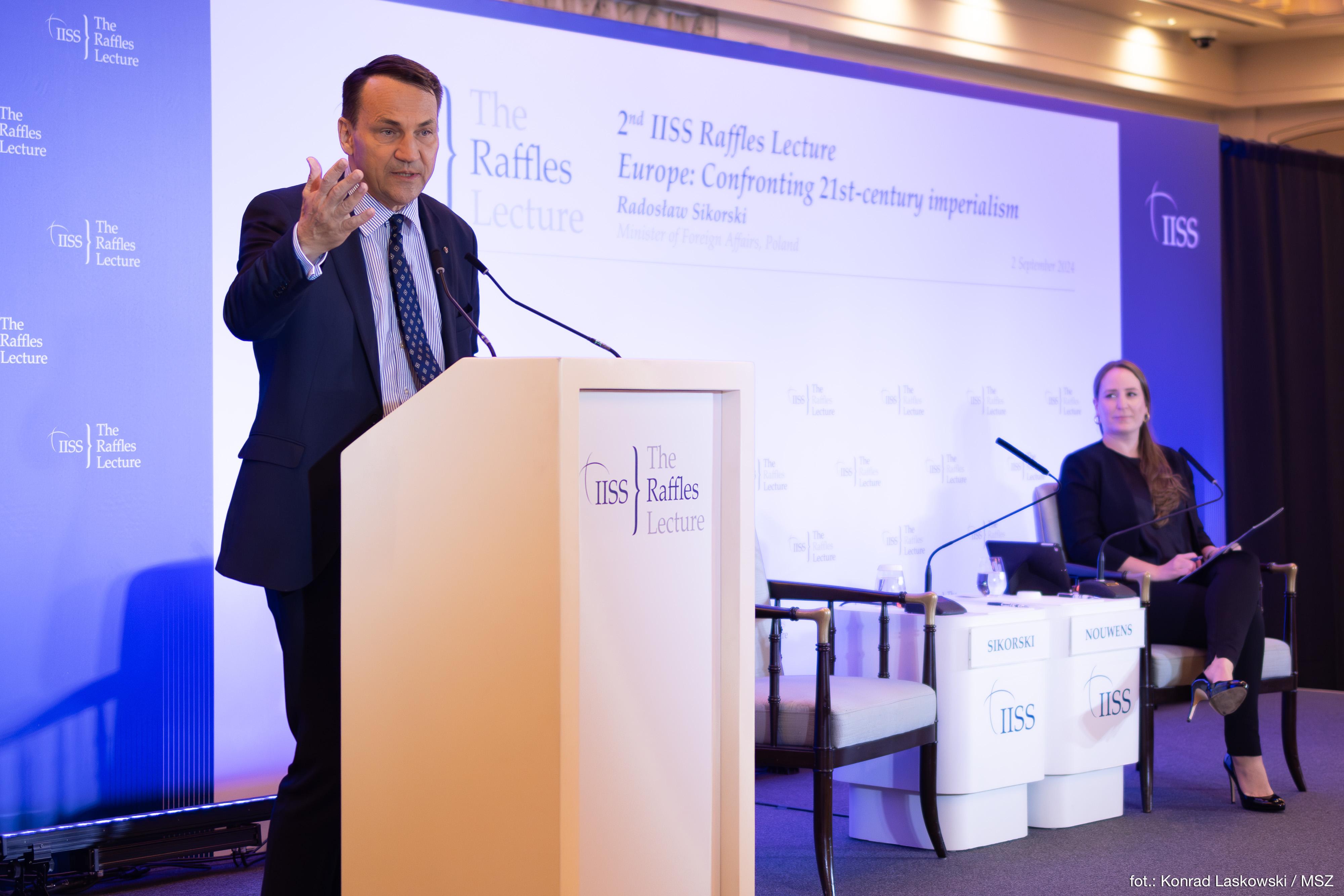 Podczas wizyty w Singapurze minister Radosław Sikorski wygłosił w tamtejszym Międzynarodowym Instytucie Studiów Strategicznych, który jest światowym autorytetem w dziedzinie globalnego bezpieczeństwa, ryzyka politycznego i konfliktów zbrojnych, wykład pt. Europe: Confronting 21st Century Imperialism”. W swoim przemówieniu zwrócił przede wszystkim uwagę na kolonialny i imperialistyczny charakter rosyjskiej wojny przeciwko Ukrainie.