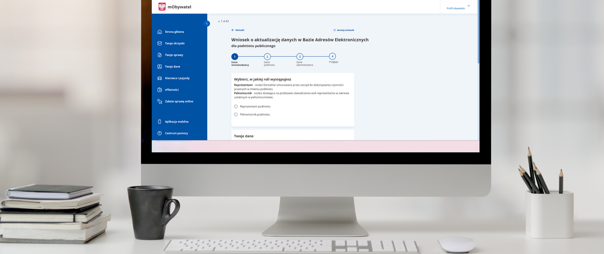 - Pierwszy etap to Dane wnioskodawcy. Na początku zaznacz, w jakiej roli występujesz: reprezentanta czy pełnomocnika.
