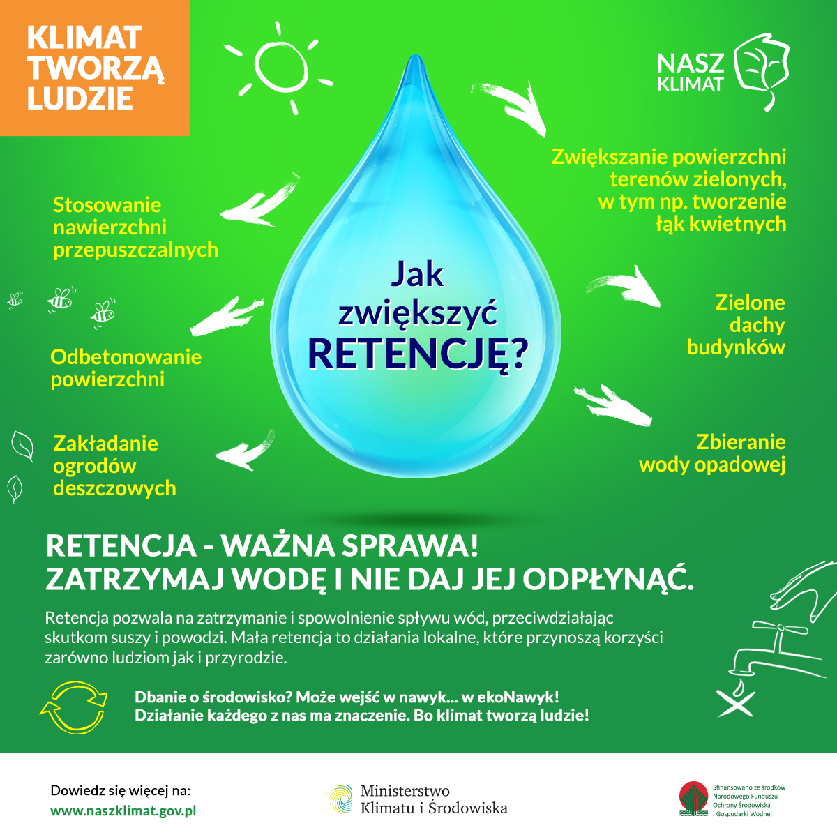 (pliki: Banner1200_1200.jpg oraz Banner1920_1080.jpg) Banner przybliża tematykę retencji wody.  Banner można wykorzystać na stronie internetowej gminy, w lokalnym portalu. Został przygotowany w dwóch formatach, są to standardowe wymiary bannerów internetowych. Zachęcamy, by linkował do strony www.naszklimat.gov.pl.