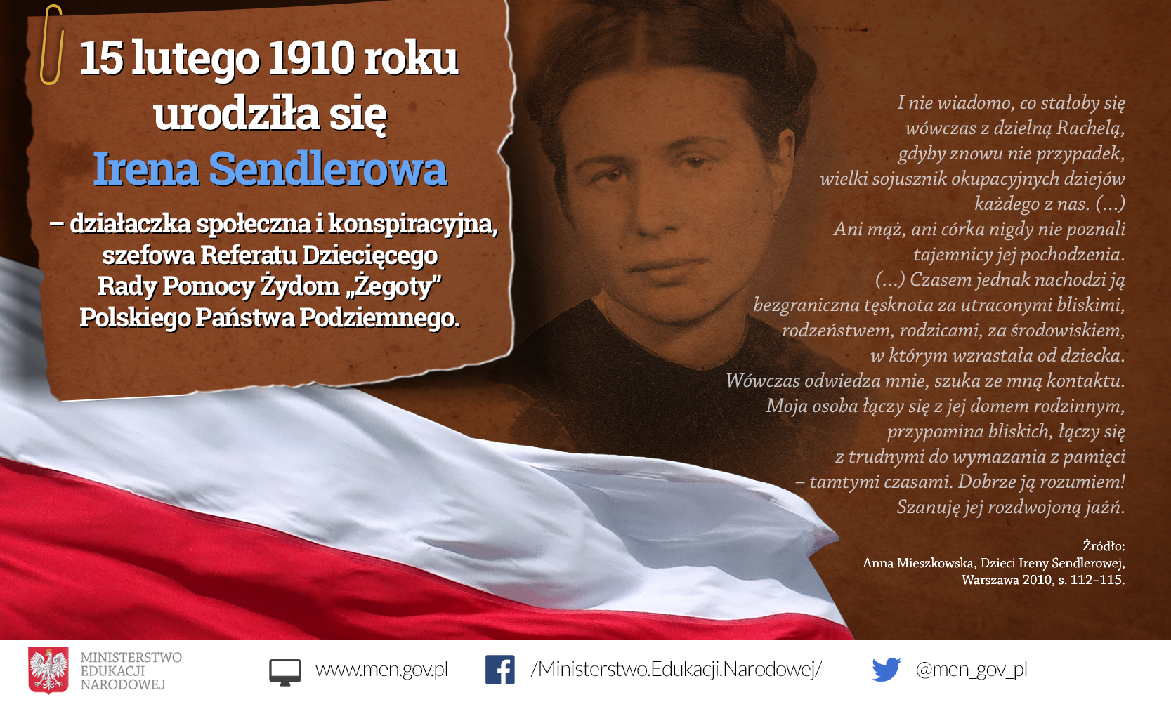 15 lutego 1910 roku w Warszawie urodziła się Irena Stanisława Sendlerowa - działaczka społeczna i charytatywna, szefowa Referatu Dziecięcego Rady Pomocy Żydom „Żegoty”, Sprawiedliwa wśród Narodów Świata, dama Orderu Orła Białego i Orderu Uśmiechu. Dziś przypada 108. rocznica jej urodzin.