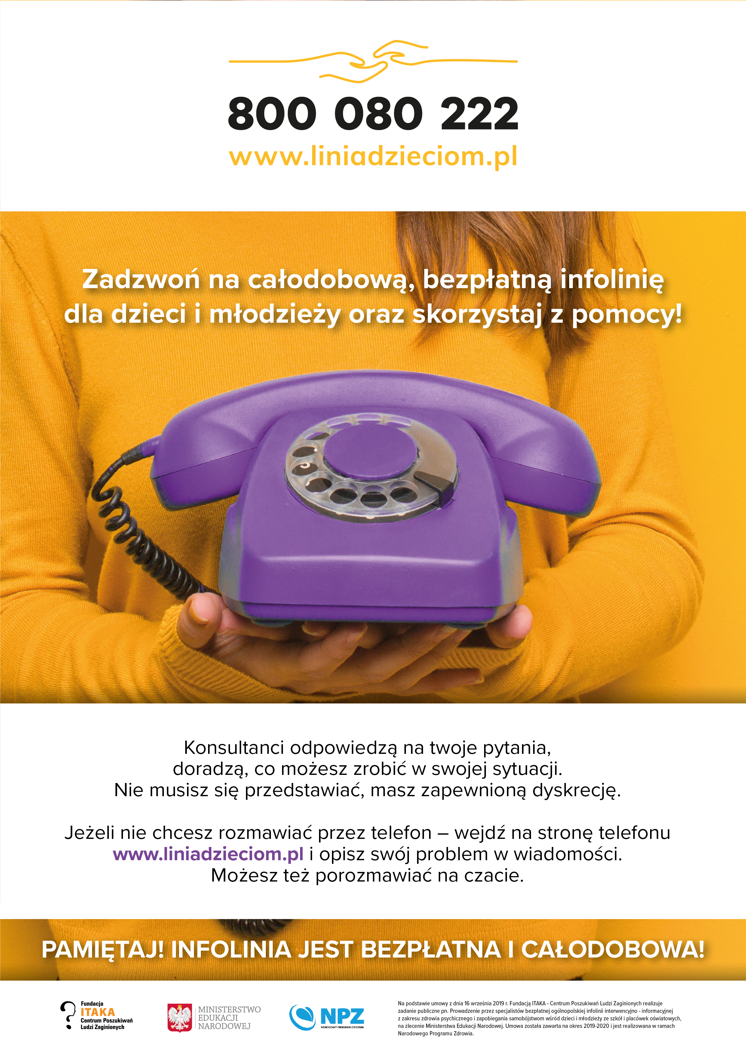 Już od dziś, 1 października 2019 r. działa nowa całodobowa, bezpłatna, ogólnopolska infolinia dla dzieci, młodzieży i ich opiekunów. Pod numerem telefonu 800 080 222 dzieci, młodzież, ale także rodzice, nauczyciele i pedagodzy będą mogli uzyskać profesjonalną pomoc doświadczonych psychologów, pedagogów i prawników.