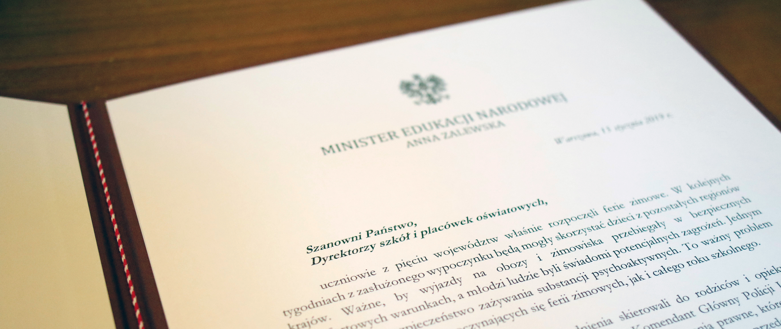 Minister Edukacji Narodowej Anna Zalewska zwróciła się dziś z prośbą do dyrektorów szkół i placówek oświatowych o zapoznanie rodziców i opiekunów uczniów ze specjalnym listem Głównego Inspektora Sanitarnego oraz Komendanta Głównego Policji dotyczącym obowiązujących rozwiązań prawnych, które ułatwiają walkę z substancjami potocznie określanymi jako „dopalacze”.