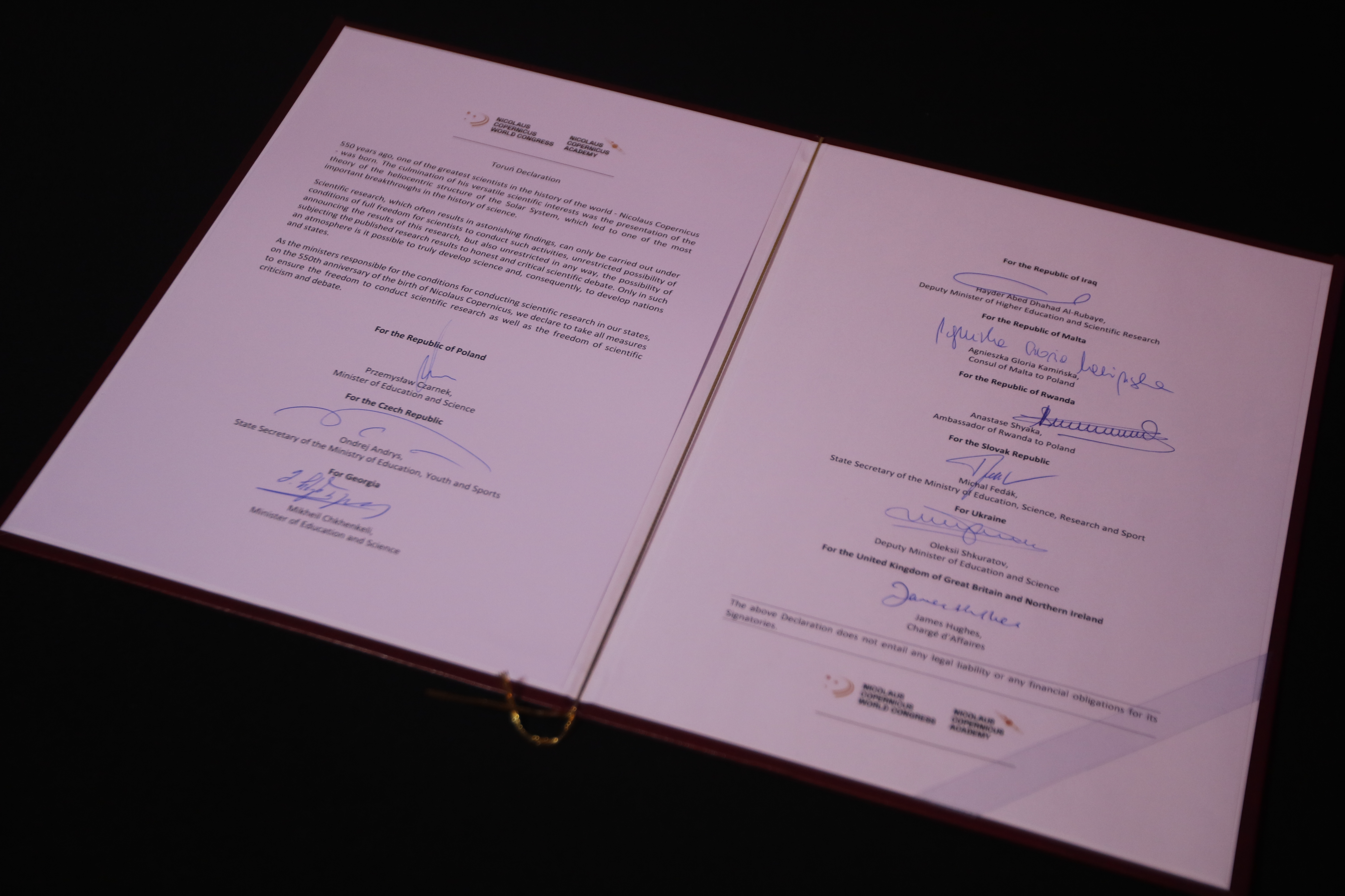 Szefowie resortów edukacji i nauki oraz dyplomaci z dziewięciu krajów podpisali „Deklarację Toruńską”. Dokument to gwarancja wolności prowadzenia badań naukowych oraz swobody krytyki i debaty naukowej. Podpisanie „Deklaracji Toruńskiej” było centralnym wydarzeniem trzeciego dnia obrad Światowego Kongresu Kopernikańskiego.