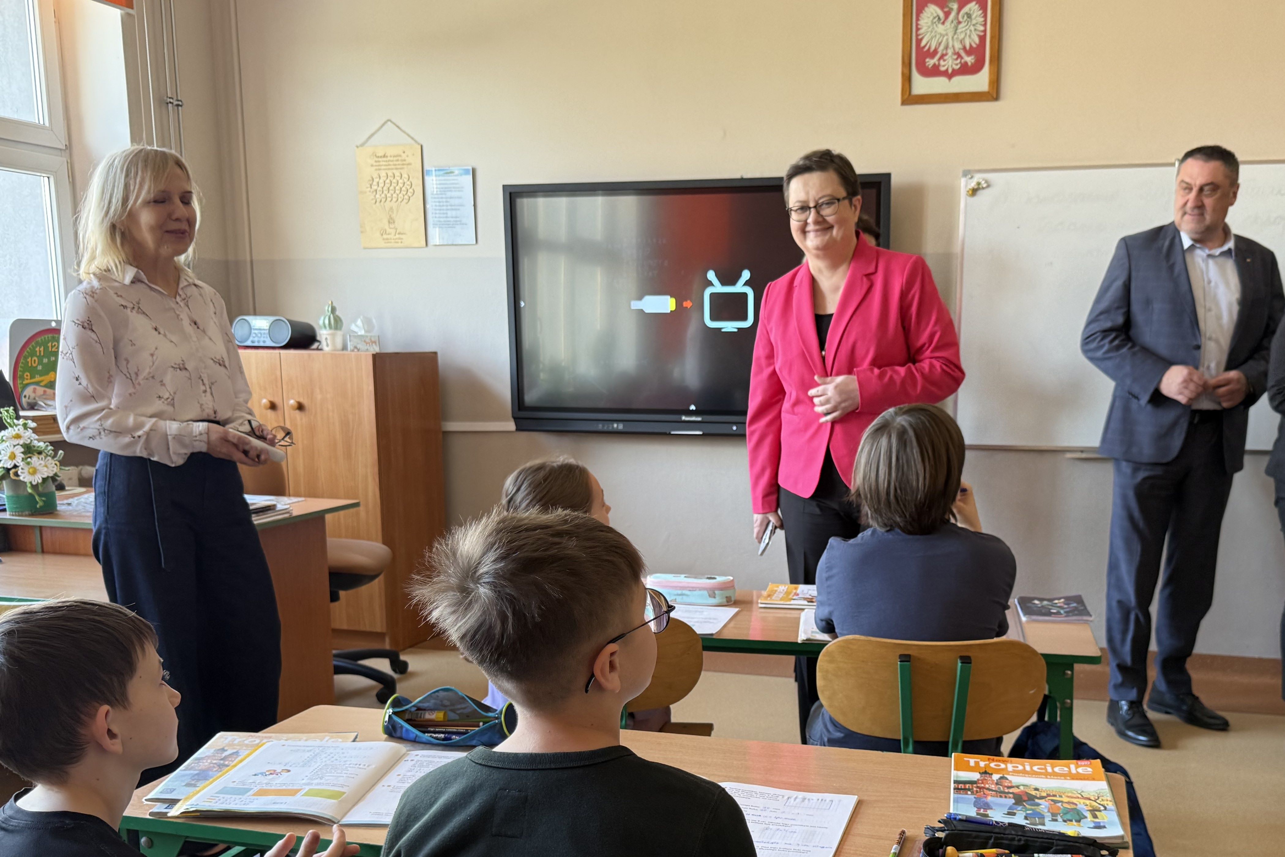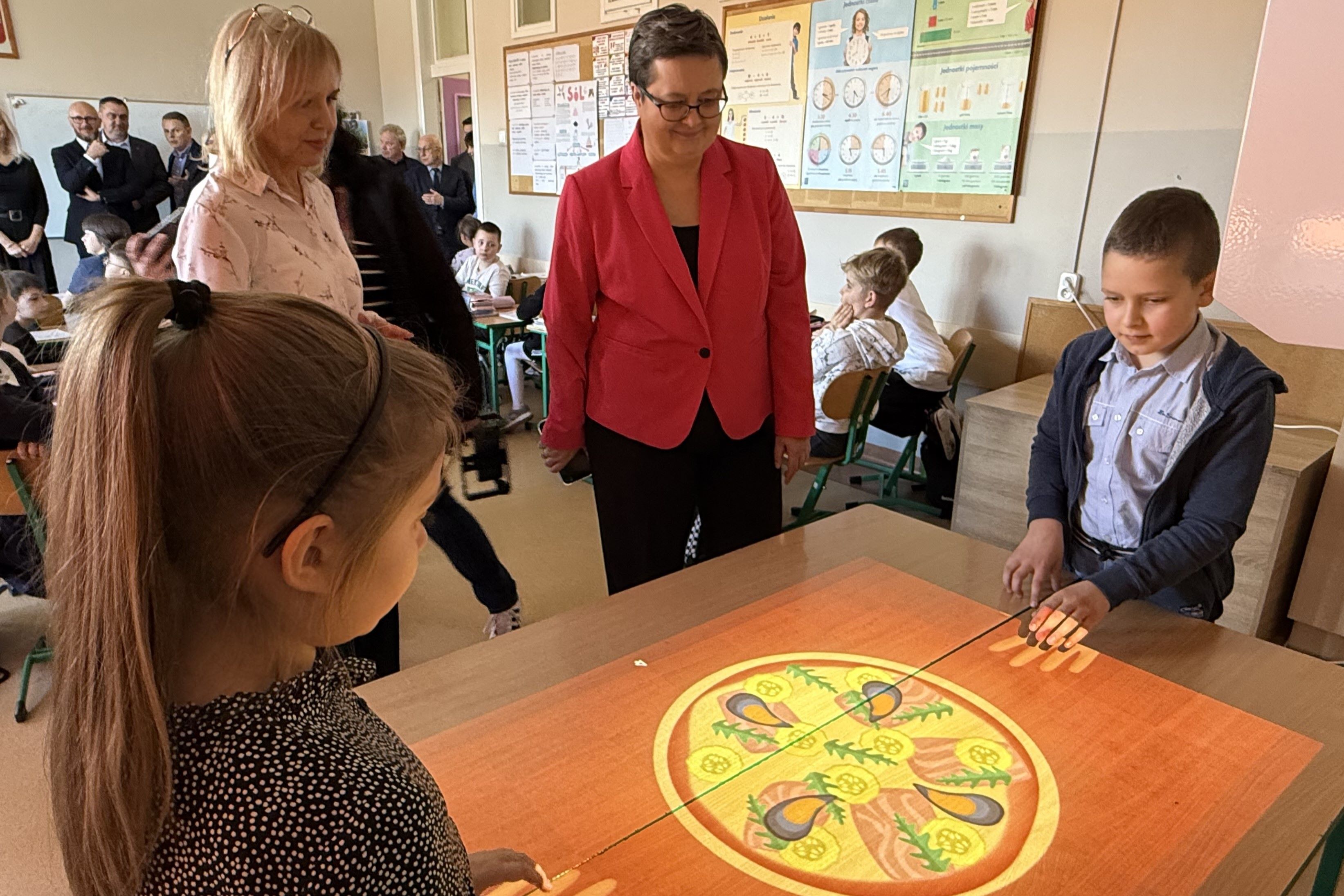 Minister miała również okazję zobaczyć interaktywną podłogę wspierającą ćwiczenia rozwijające motorykę małą i dużą uczniów. Poznała także pomysły na aktywne spędzanie przerw, takie jak interaktywne wersje gier stolikowych – np. cymbergaj czy piłkarzyki – które pomagają uczniom oderwać się od ekranów telefonów.