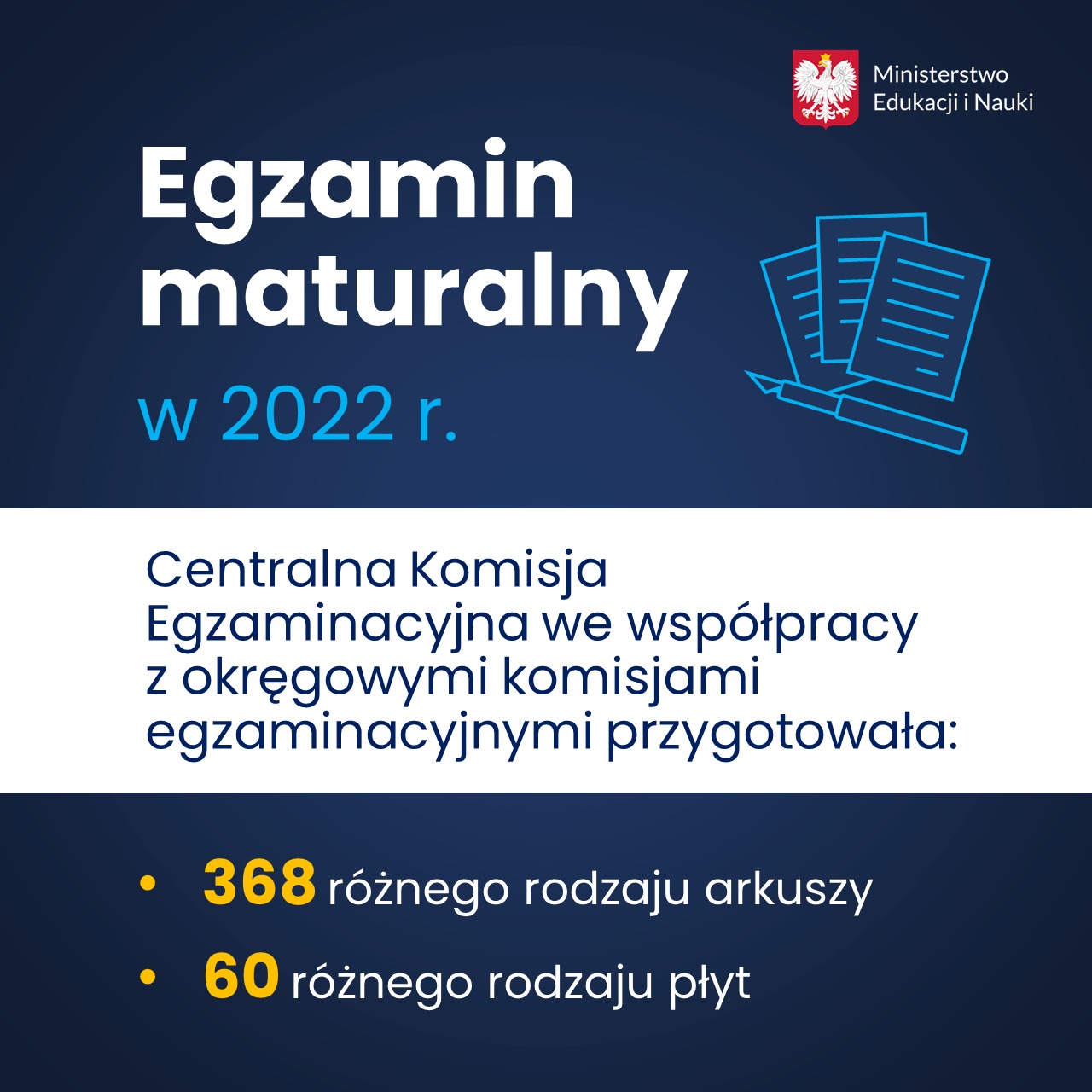 Do przeprowadzenia egzaminu maturalnego w maju 2022 r. (w terminie głównym) Centralna Komisja Egzaminacyjna we współpracy z okręgowymi komisjami egzaminacyjnymi przygotowała 368 różnego rodzaju arkuszy oraz 60 różnego rodzaju płyt (do egzaminów z języków obcych nowożytnych, informatyki i historii muzyki), w tym w formach dostosowanych do potrzeb osób z niepełnosprawnościami oraz do potrzeb zdających-obywateli Ukrainy.