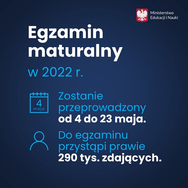 W 2022 r. egzamin maturalny (sesja główna) będzie przeprowadzany od 4 do 23 maja, w tym: