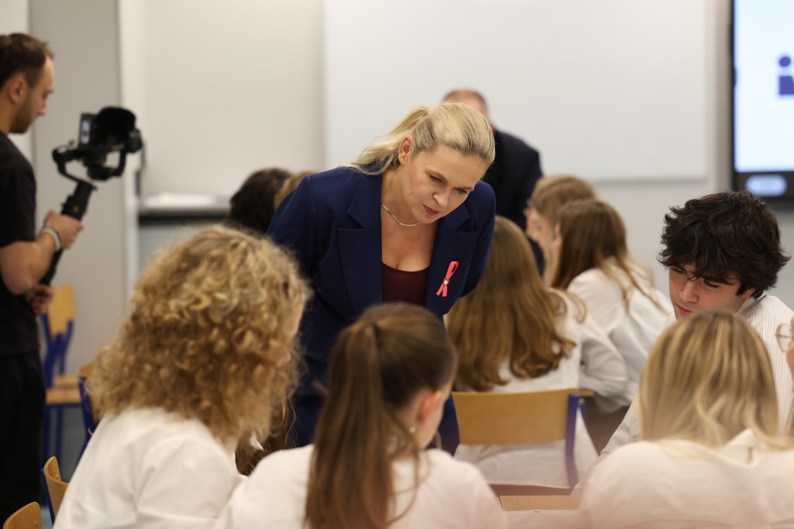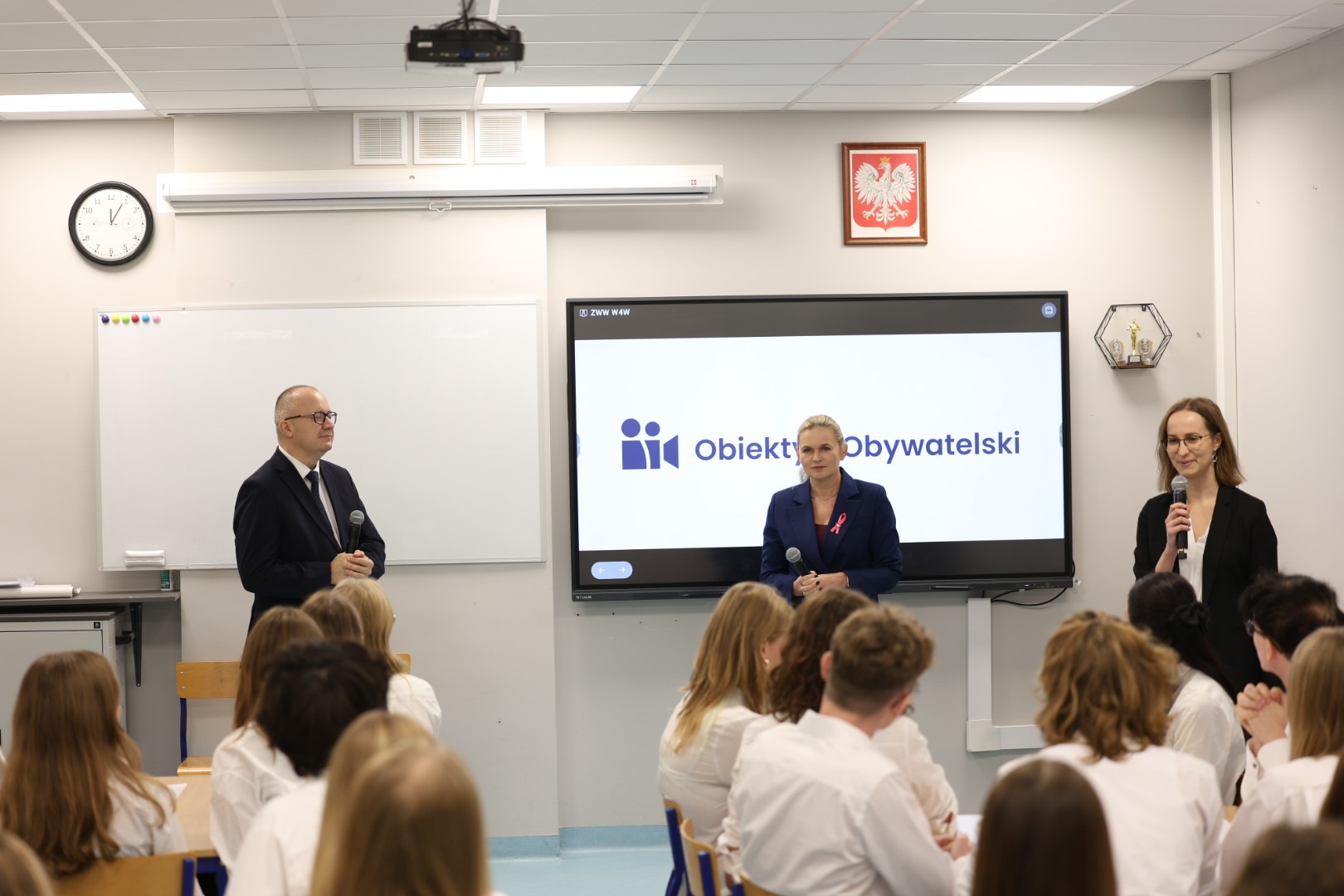 Po konferencji prasowej odbyła się pokazowa lekcja obywatelska, podczas której Ministrowie rozmawiali z uczniami m.in. o nadrzędnych wartościach konstytucyjnych.