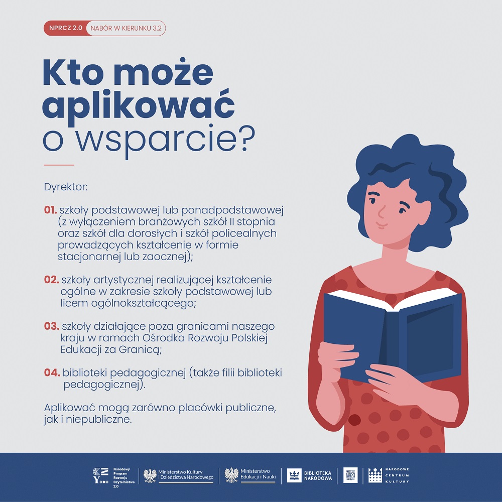 - zakup książek będących nowościami wydawniczymi i niebędących podręcznikami, w szczególności książek historycznych, w tym poświęconych historii Polski XX wieku, oraz lektur szkolnych, w tym książek opublikowanych drukiem lub na innym nośniku (w tym książek obrazkowych, mówionych i elektronicznych), które są dostępne na rynku księgarskim, niezależnie od tego, czy jest to pierwsze wydanie czy wznowienie książki,