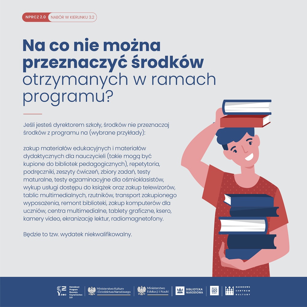 PAMIĘTAJ. Jeśli jesteś dyrektorem szkoły, środków nie przeznaczaj na (wybrane przykłady): zakup materiałów edukacyjnych i materiałów dydaktycznych dla nauczycieli (takie mogą być kupione do bibliotek pedagogicznych), repetytoria, podręczniki, zeszyty ćwiczeń, zbiory zadań, testy maturalne, testy egzaminacyjne dla ośmioklasistów, wykup usługi dostępu do książek oraz zakup telewizorów, tablic multimedialnych, rzutników, transport zakupionego wyposażenia, remont biblioteki, zakup komputerów dla uczniów, centra multimedialne, tablety graficzne, ksero, kamery video, ekranizację lektur, radiomagnetofony. Będzie to tzw. wydatek niekwalifikowalny.