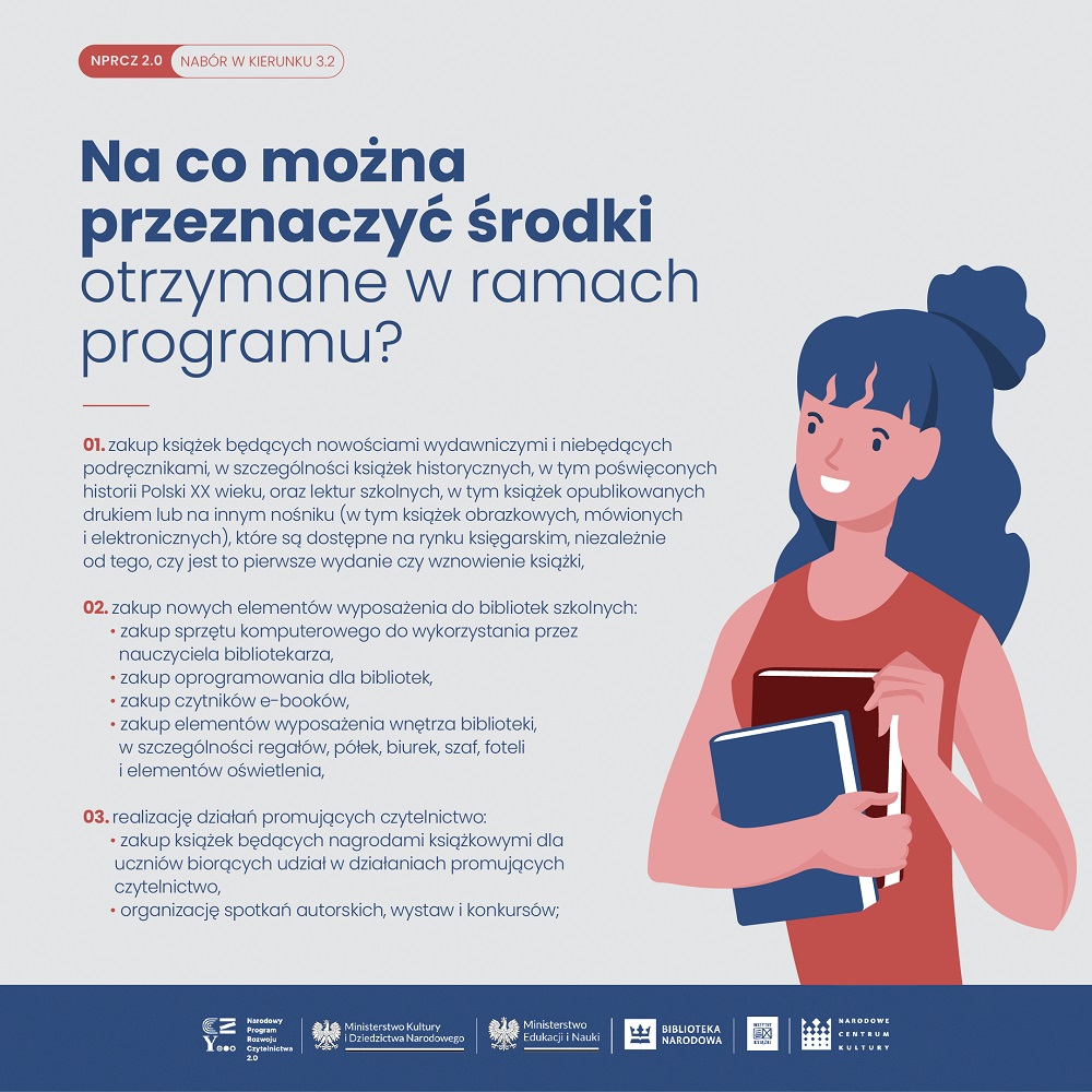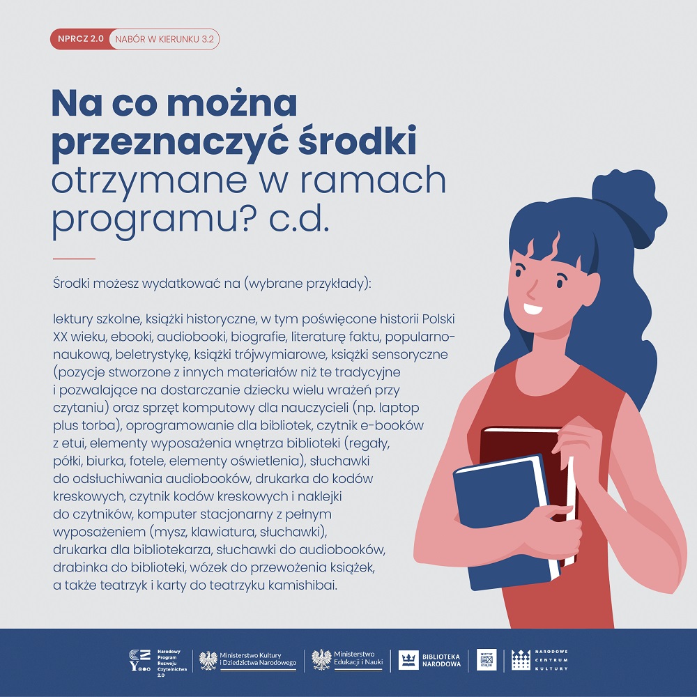 Środki możesz wydatkować na (wybrane przykłady): lektury szkolne, książki historyczne, w tym poświęcone historii Polski XX wieku, ebooki, audiobooki, biografie, literaturę faktu, popularnonaukową, beletrystykę, książki trójwymiarowe, książki sensoryczne (pozycje stworzone z innych materiałów niż te tradycyjne i pozwalające na dostarczanie dziecku wielu wrażeń przy czytaniu) oraz sprzęt komputowy dla nauczycieli (np. laptop plus torba), oprogramowanie dla bibliotek, czytnik e-booków z etui, elementy wyposażenia wnętrza biblioteki (regały, półki, biurka, fotele, elementy oświetlenia), słuchawki do odsłuchiwania audiobooków, drukarka do kodów kreskowych, czytnik kodów kreskowych i naklejki do czytników, komputer stacjonarny z pełnym wyposażeniem (mysz, klawiatura, słuchawki), drukarka dla bibliotekarza, słuchawki do audiobooków, drabinka do biblioteki, wózek do przewożenia książek, a także teatrzyk i karty do teatrzyku kamishibai. Więcej znajdziesz w części Pytania i odpowiedzi.
