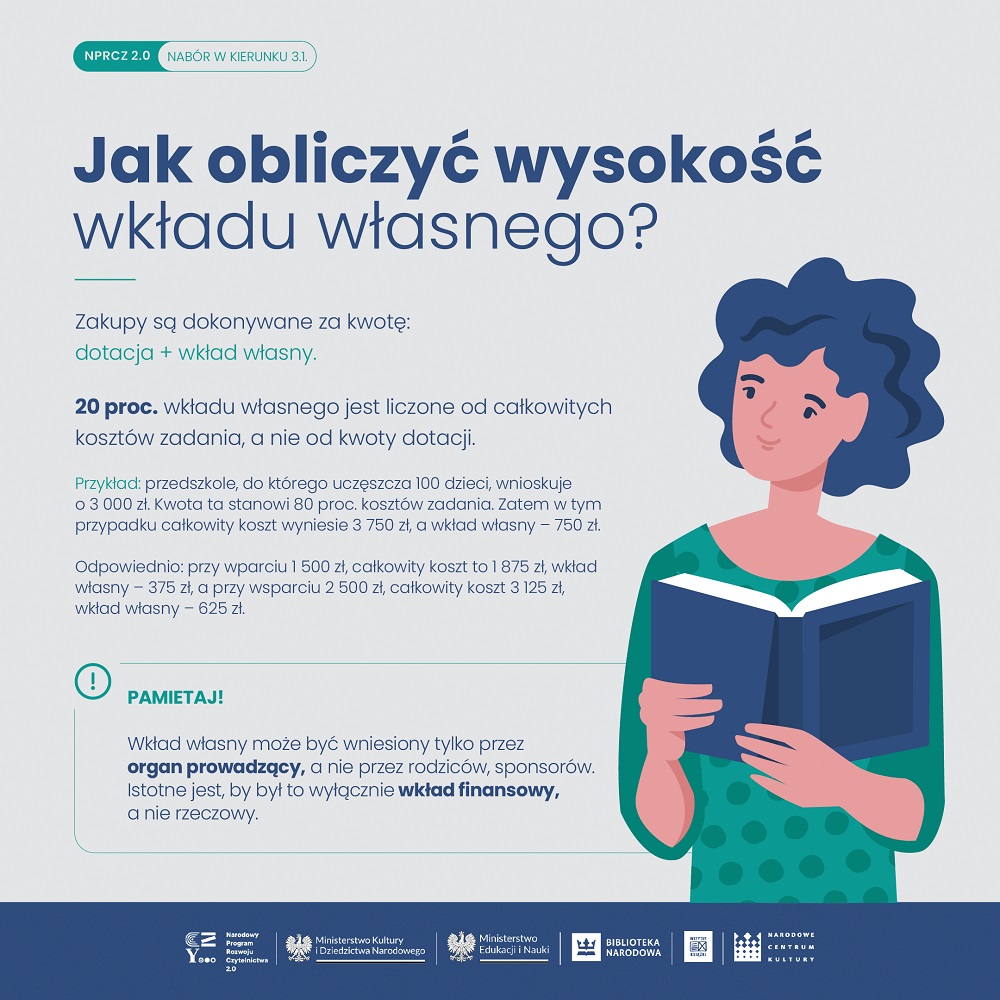 PAMIĘTAJ. Wsparcie finansowe z budżetu państwa w formie dotacji celowej zostanie udzielone pod warunkiem zapewnienia przez organ prowadzący szkołę lub bibliotekę pedagogiczną wkładu własnego w wysokości 20% kwoty kosztów realizacji zadania. Obowiązek wniesienia wkładu własnego nie dotyczy szkół prowadzonych przez ministrów. Ministrowie otrzymują wparcie w formie dofinansowania.