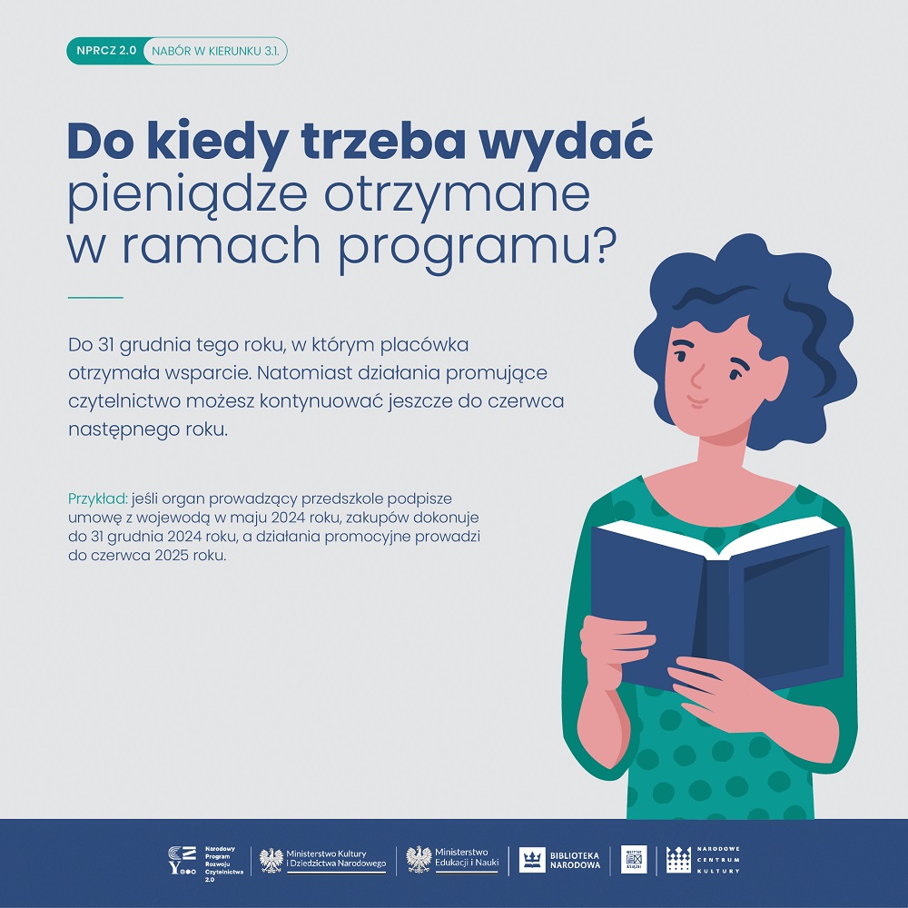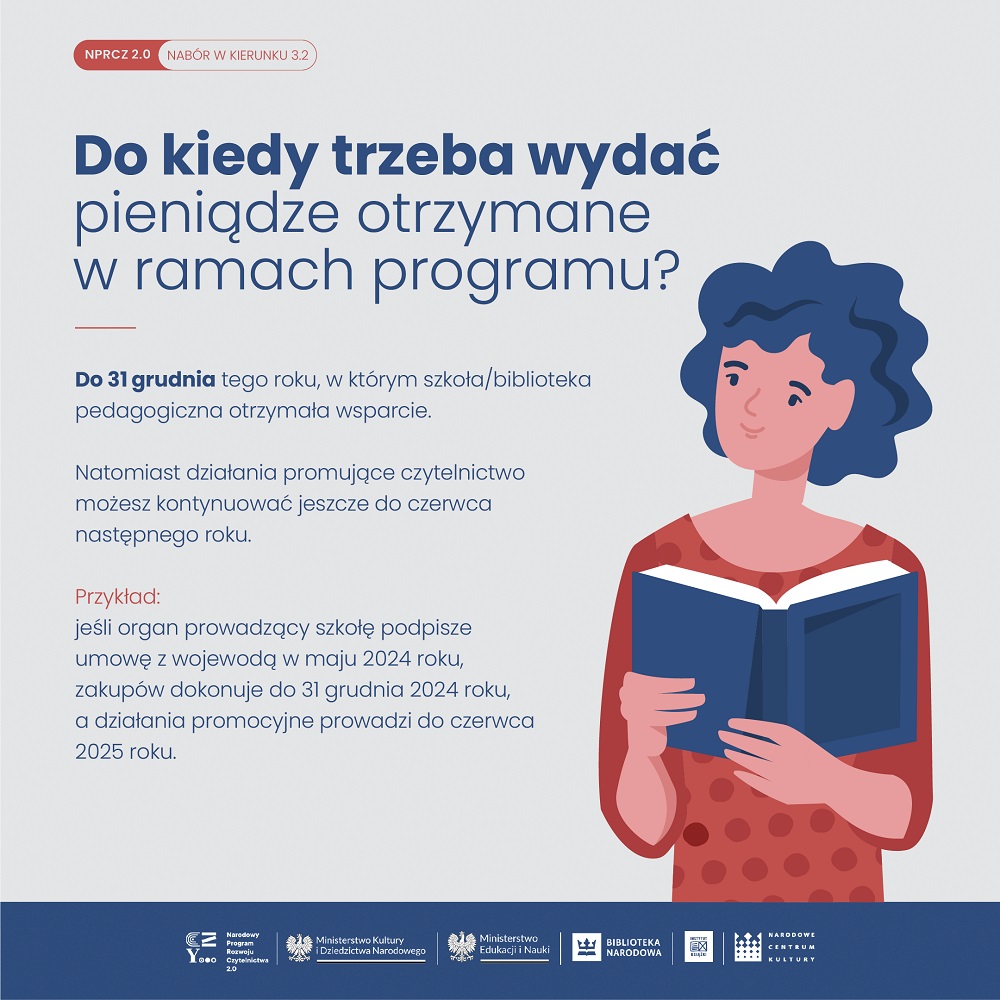 Do 31 grudnia tego roku, w którym placówka otrzymała wsparcie. Natomiast działania promujące czytelnictwo możesz kontynuować jeszcze do czerwca następnego roku.