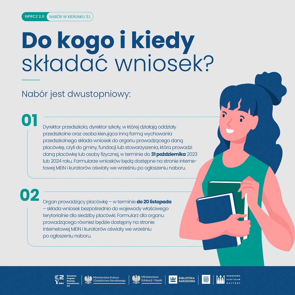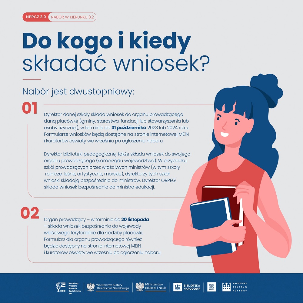 - Dyrektor danej szkoły składa wniosek do organu prowadzącego daną placówkę, czyli do gminy, starostwa, fundacji lub stowarzyszenia, która prowadzi daną placówkę lub osoby fizycznej, w terminie do 31 października 2023 lub 2024 roku. Formularze wniosków będą dostępne na stronie internetowej MEN i kuratorów oświaty we wrześniu po ogłoszeniu naboru. Dyrektor biblioteki pedagogicznej także składa wniosek do swojego organu prowadzącego (samorządu województwa). W przypadku szkół prowadzących przez właściwych ministrów (w tym szkoły rolnicze, leśne, artystyczne, morskie), dyrektorzy tych szkół wnioski składają bezpośrednio do ministrów. Dyrektor ORPEG składa wniosek bezpośrednio do ministra edukacji.