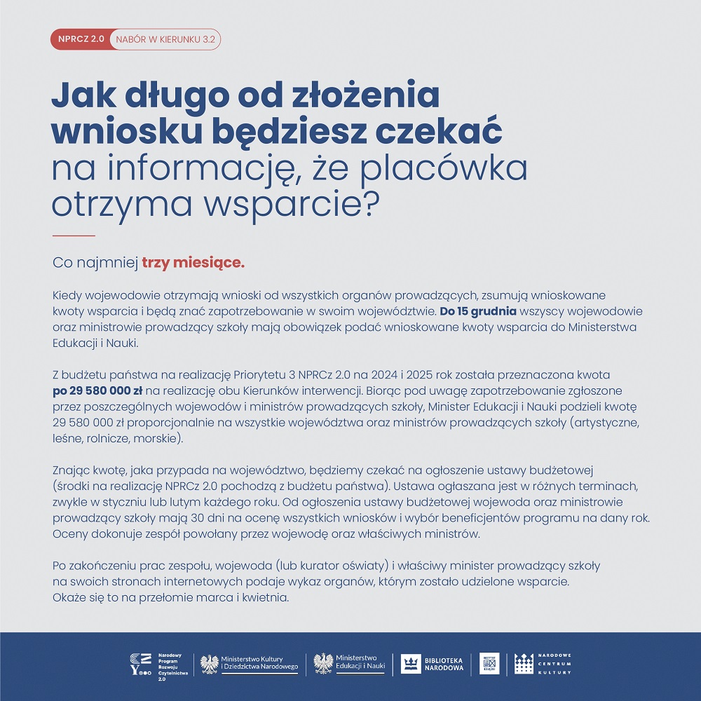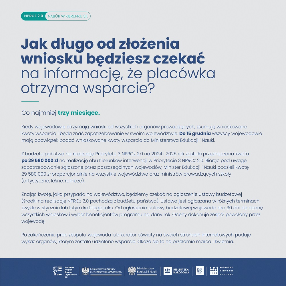 Znając kwotę, jaka przypada na województwo, będziemy czekać na ogłoszenie ustawy budżetowej (środki na realizację NPRCz 2.0 pochodzą z budżetu państwa). Ustawa ogłaszana jest w różnych terminach, zwykle w miesiącu styczniu lub lutym każdego roku. Od ogłoszenia ustawy budżetowej wojewoda oraz ministrowie prowadzący szkoły mają 30 dni na ocenę wszystkich wniosków i wybór beneficjentów programu na dany rok. Oceny dokonuje zespół powołany przez wojewodę oraz właściwych ministrów.