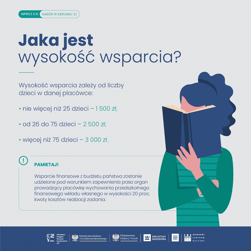 PAMIĘTAJ. Wsparcie finansowe z budżetu państwa zostanie udzielone pod warunkiem zapewnienia przez organ prowadzący placówkę wychowania przedszkolnego finansowego wkładu własnego w wysokości 20% kwoty kosztów realizacji zadania.