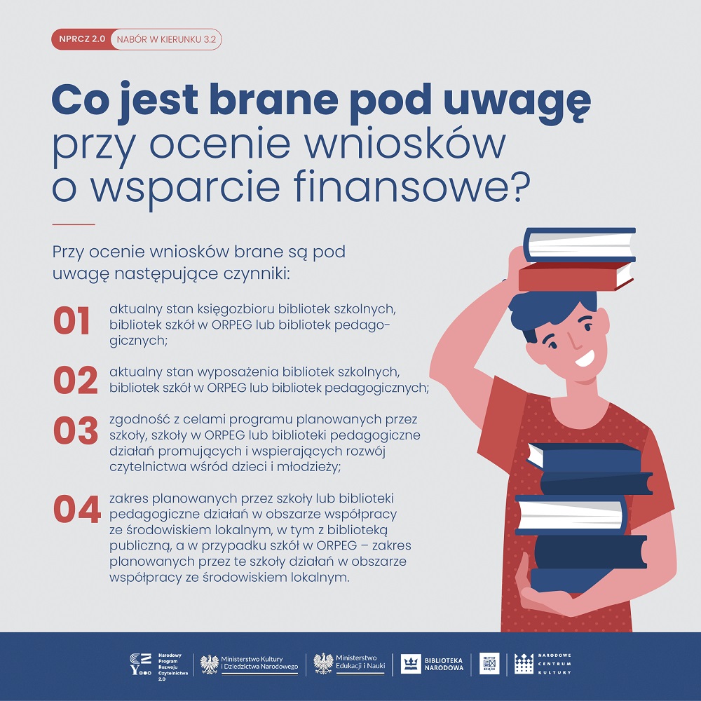 - zgodność z celami programu planowanych przez szkoły, szkoły w ORPEG lub biblioteki pedagogiczne działań promujących i wspierających rozwój czytelnictwa wśród dzieci i młodzieży;