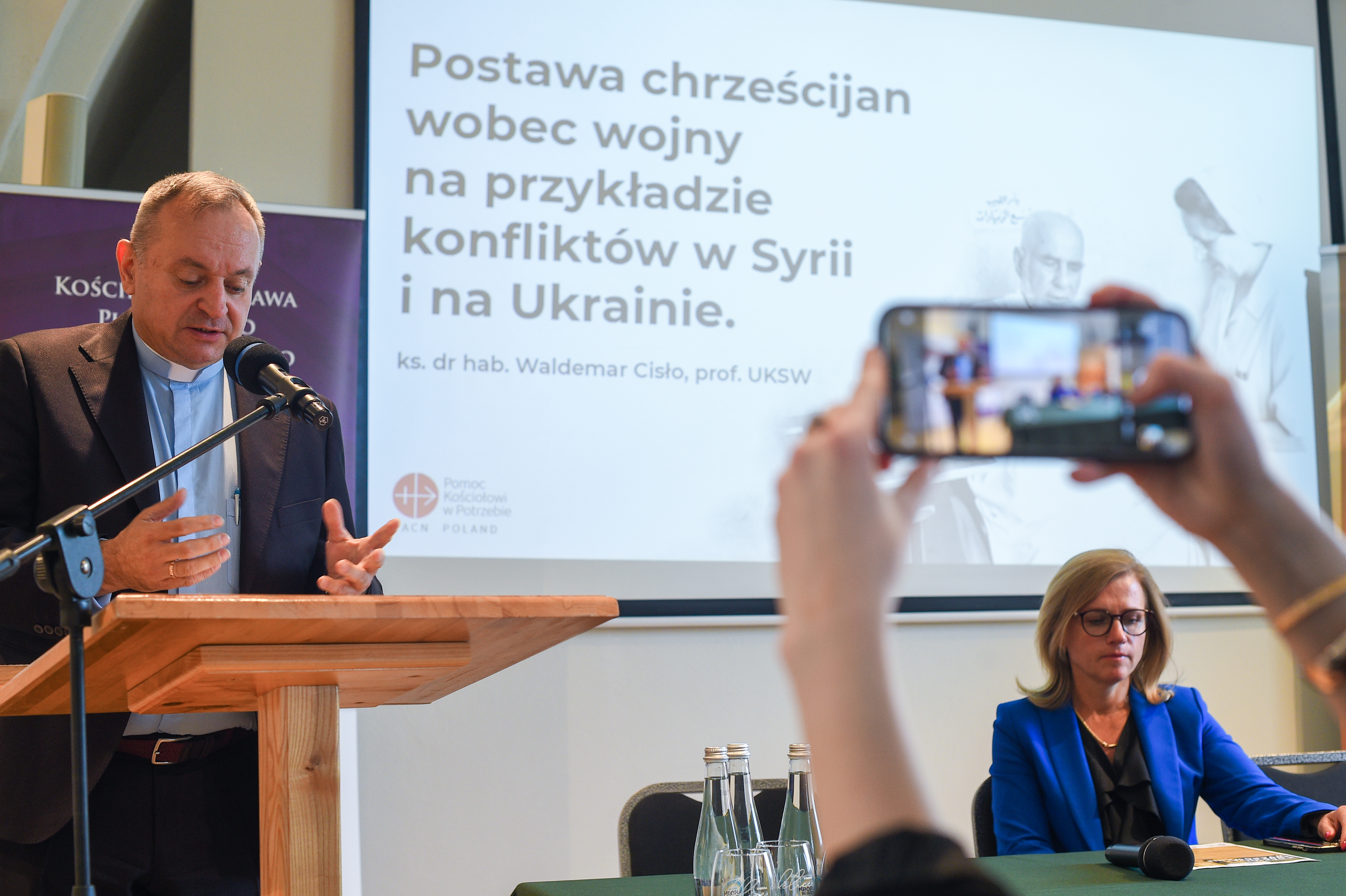 Za drewnianą mównicą stoi minister Czarnek i mówi do mikrofonu, obok niego stół nakryty zielonym materiałem, za nim na białej ścianie wisi wielki ekran, nad nim krzyż.