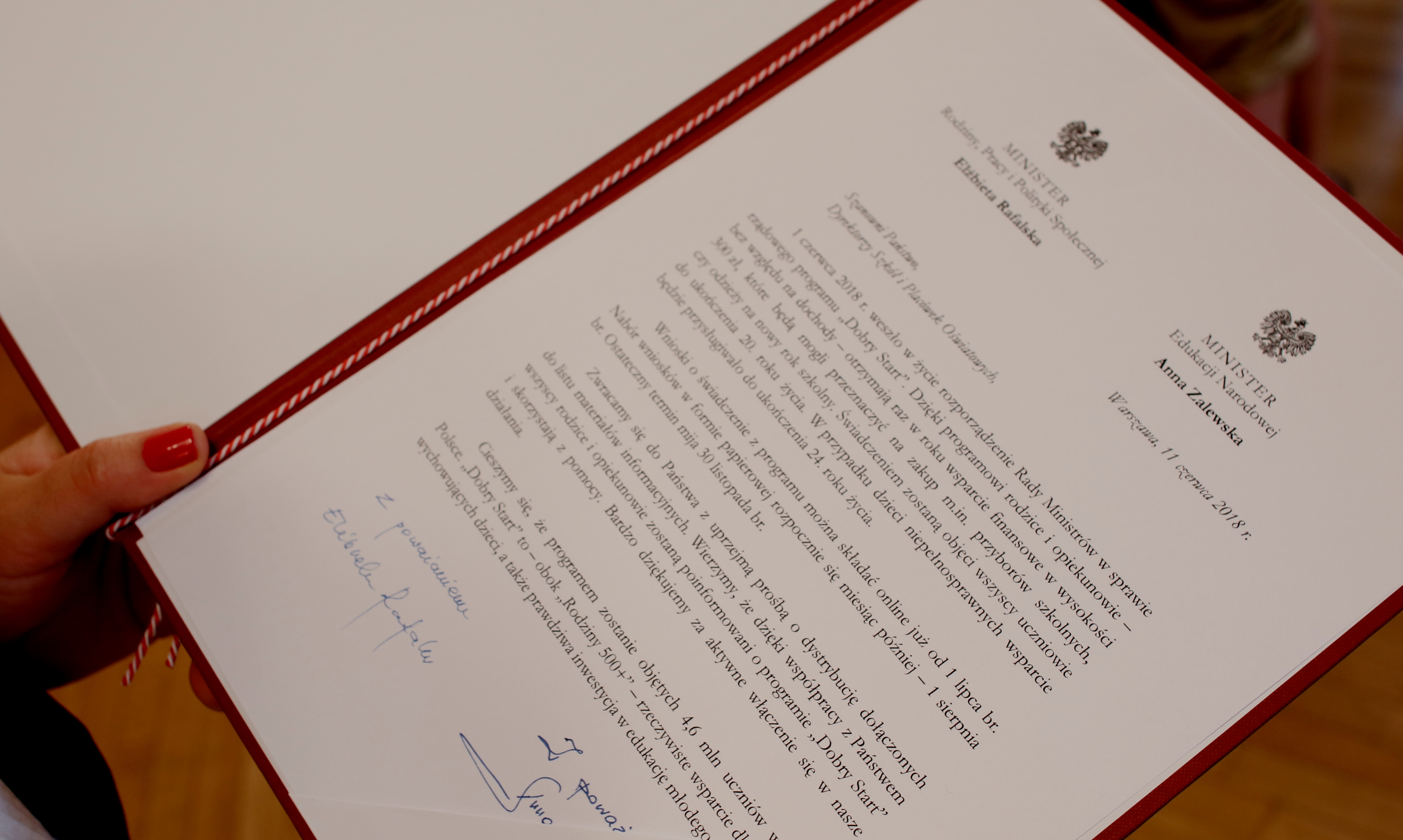 Dziś, 11 czerwca br. zainaugurowano akcję informacyjną rządowego programu „Dobry Start”. W związku z tym Minister Edukacji Narodowej Anna Zalewska oraz Minister Rodziny, Pracy i Polityki Społecznej wystosowały wspólny list do dyrektorów szkół, w którym zwróciły się z prośbą o aktywne włączenie się do działań informacyjnych dotyczących programu „Dobry Start”, tak aby informacja na temat możliwości uzyskania świadczenia trafiła do wszystkich rodziców i opiekunów uczących się dzieci.